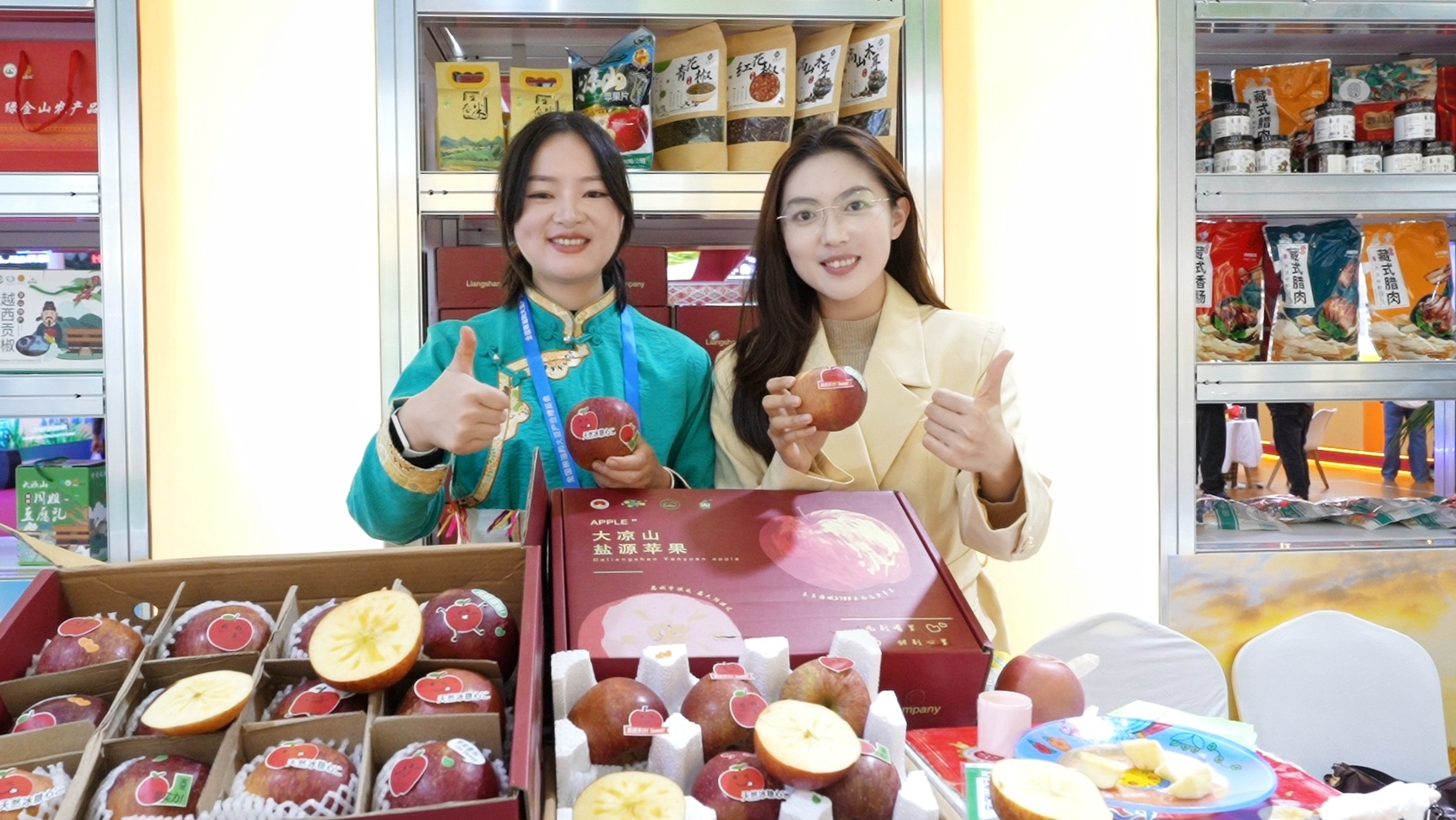 展位前,凉山草精灵农业负责人周静徒手掰开一个盐源苹果,清脆的断裂声与飞溅的果汁瞬间吸引了众人目光。“我们的苹果生长在海拔2500米以上的高原,昼夜温差大、日照时间长,利于糖分积累。尤其是霜降之后,‘冰糖心’会格外明显。”周静介绍。为了直观展现盐源苹果核心卖点,她特意为苹果贴上了可爱的“表情包”小标签,以生动有趣的展示方式拉近了与消费者的距离。
