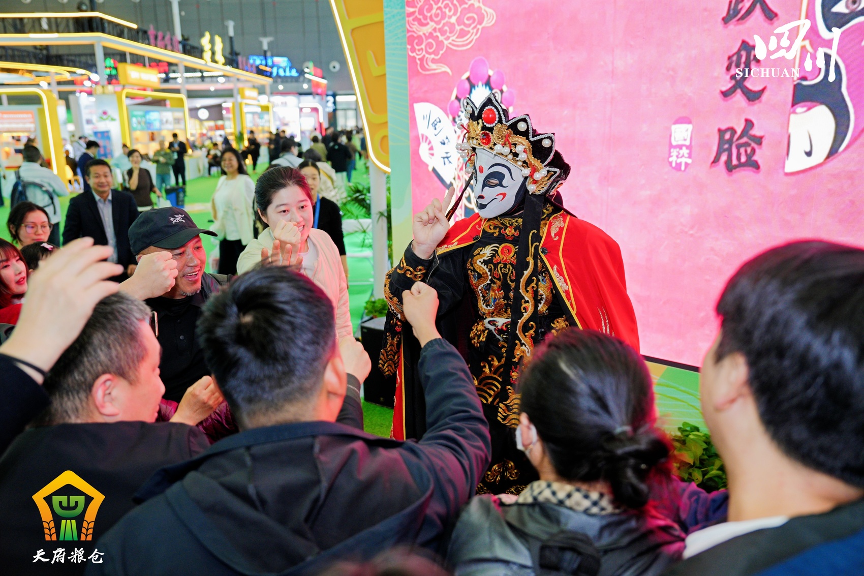 四川展台给大家带来“变脸”节目表演,吸引众人围观。