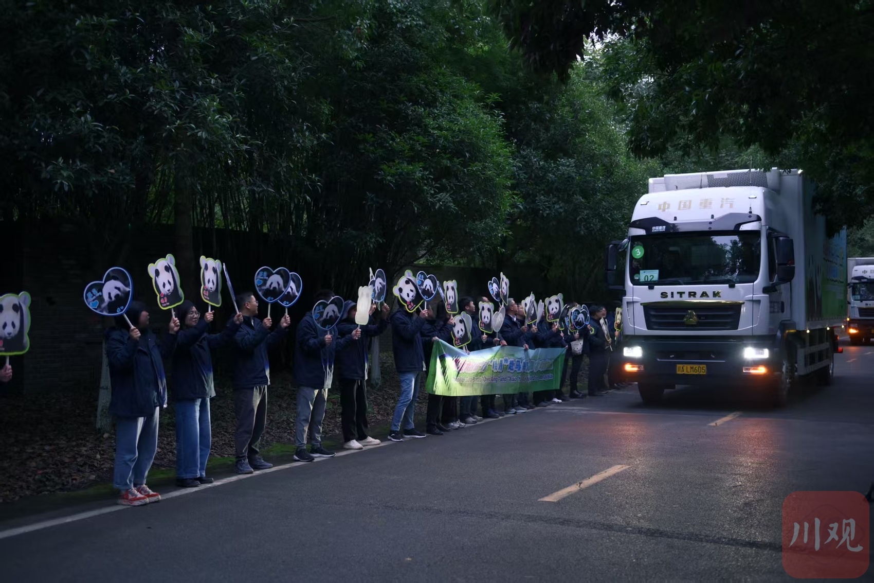 上午7时许,中国大熊猫保护研究中心(以下简称“熊猫中心”)都江堰基地早早开启两只大熊猫的运输准备工作。记者注意到,和两只“滚滚”一起装上车的,还有多箱“专属口粮”,包括竹子、竹笋、果蔬等。