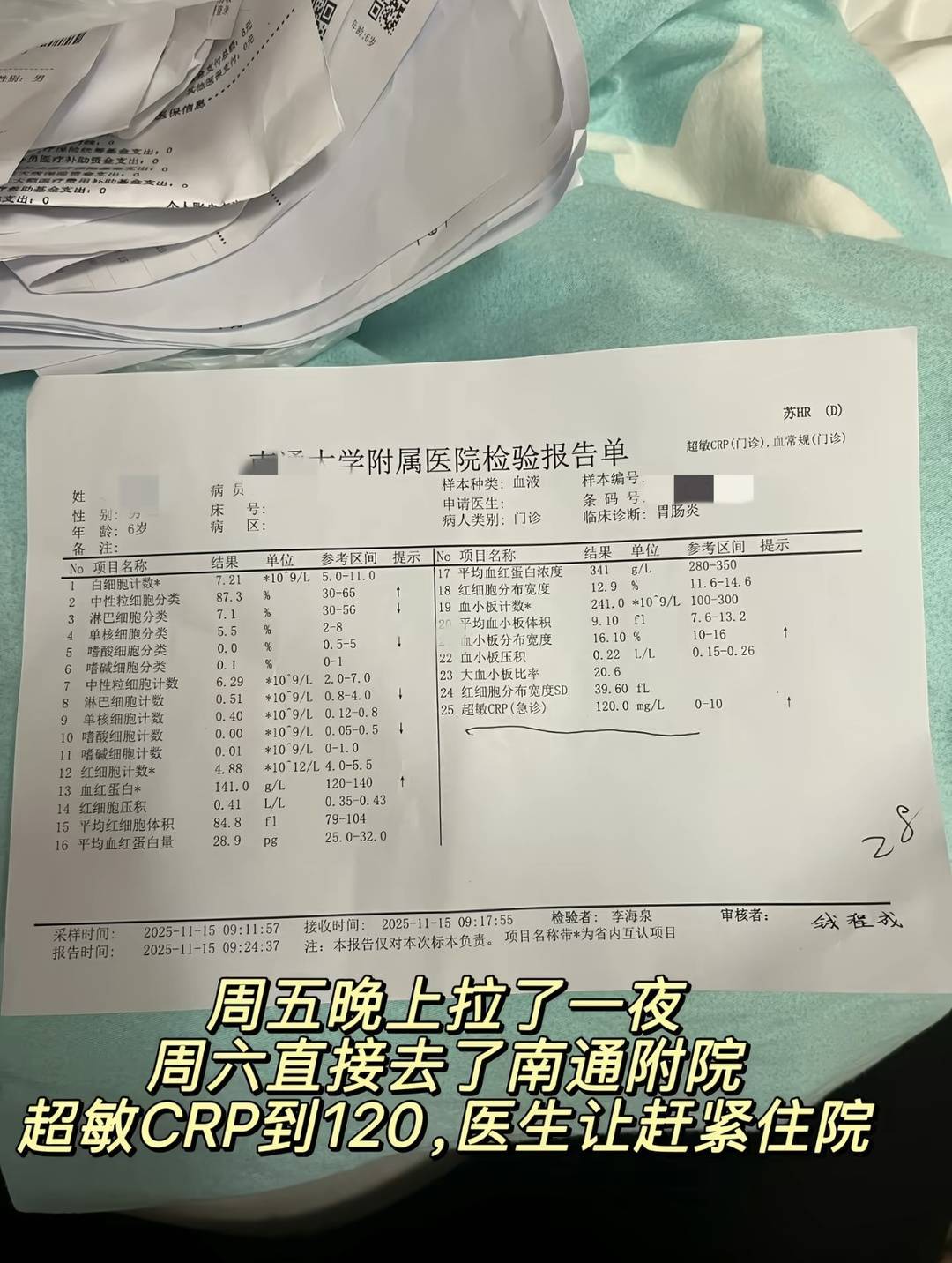 一位网友晒出了支付记录以及医院的检验报告单。据她介绍,13日下午,奶奶带着6岁的儿子去买了两个提拉米苏,共计50元。该网友和儿子各吃了一个提拉米苏,14日早上,儿子就开始呕吐,当晚拉了一夜肚子。南通大学附属医院出具的检验报告单显示,“超敏CRP(急诊)”一项结果为120.0mg/L,而标准值应该是0-10mg/L。随后,儿子住院挂水治疗。