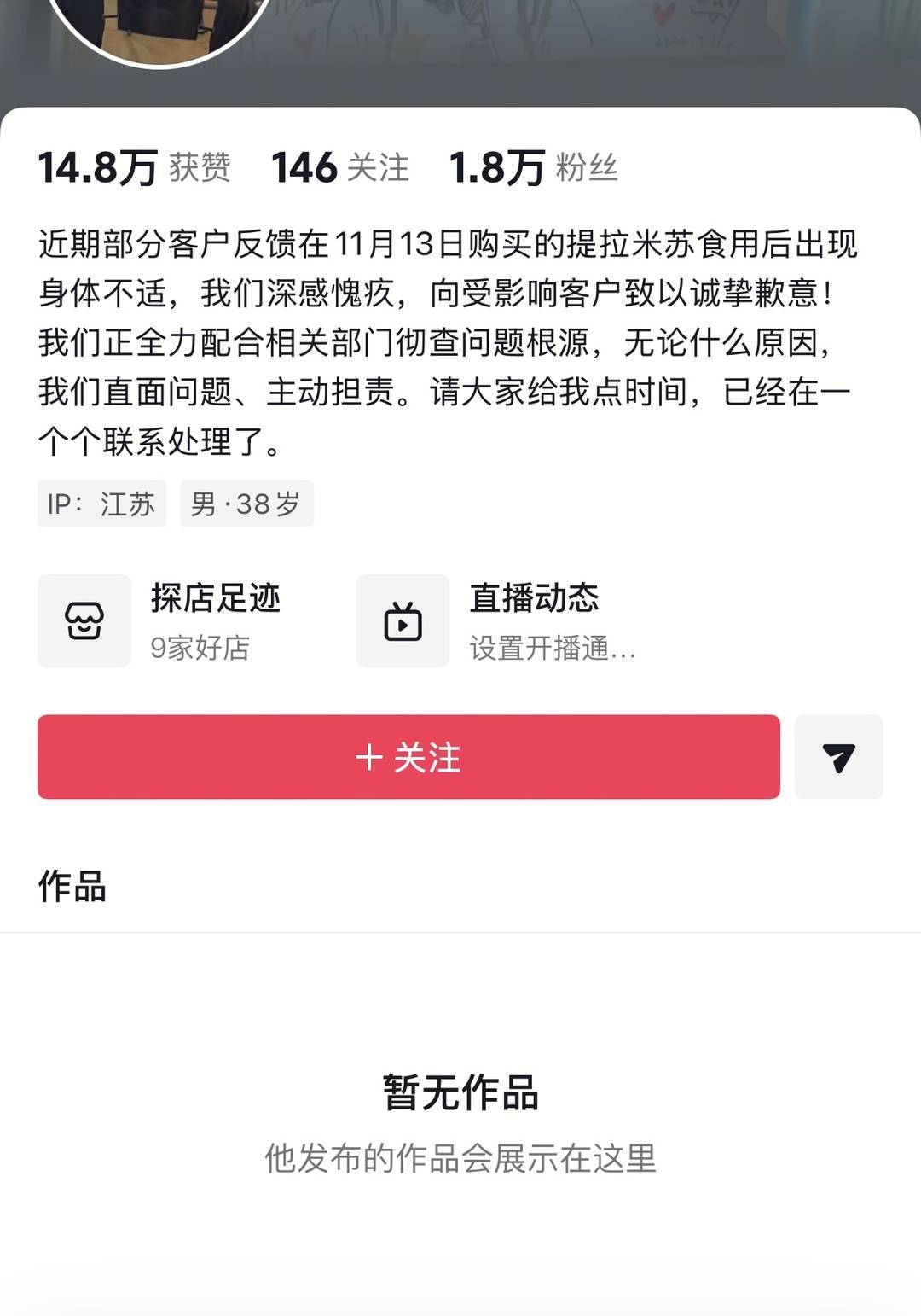 记者注意到,该店的社交平台账号上,作品已删除。其账号简介已改为:“近期部分客户反馈在11月13日购买的提拉米苏食用后出现身体不适,我们深感愧疚,向受影响客户致以诚挚歉意!”其中还提到,正在配合相关部门彻查问题根源,“已经在一个个联系处理了”。