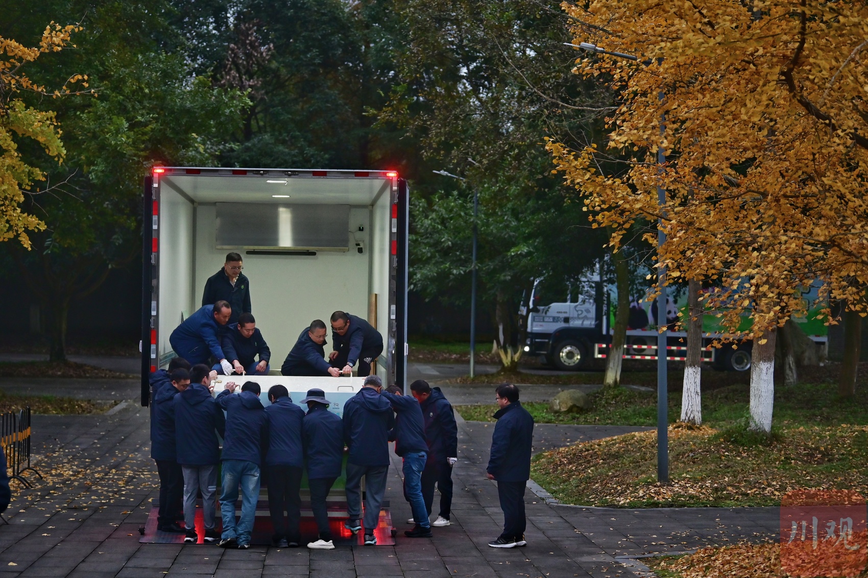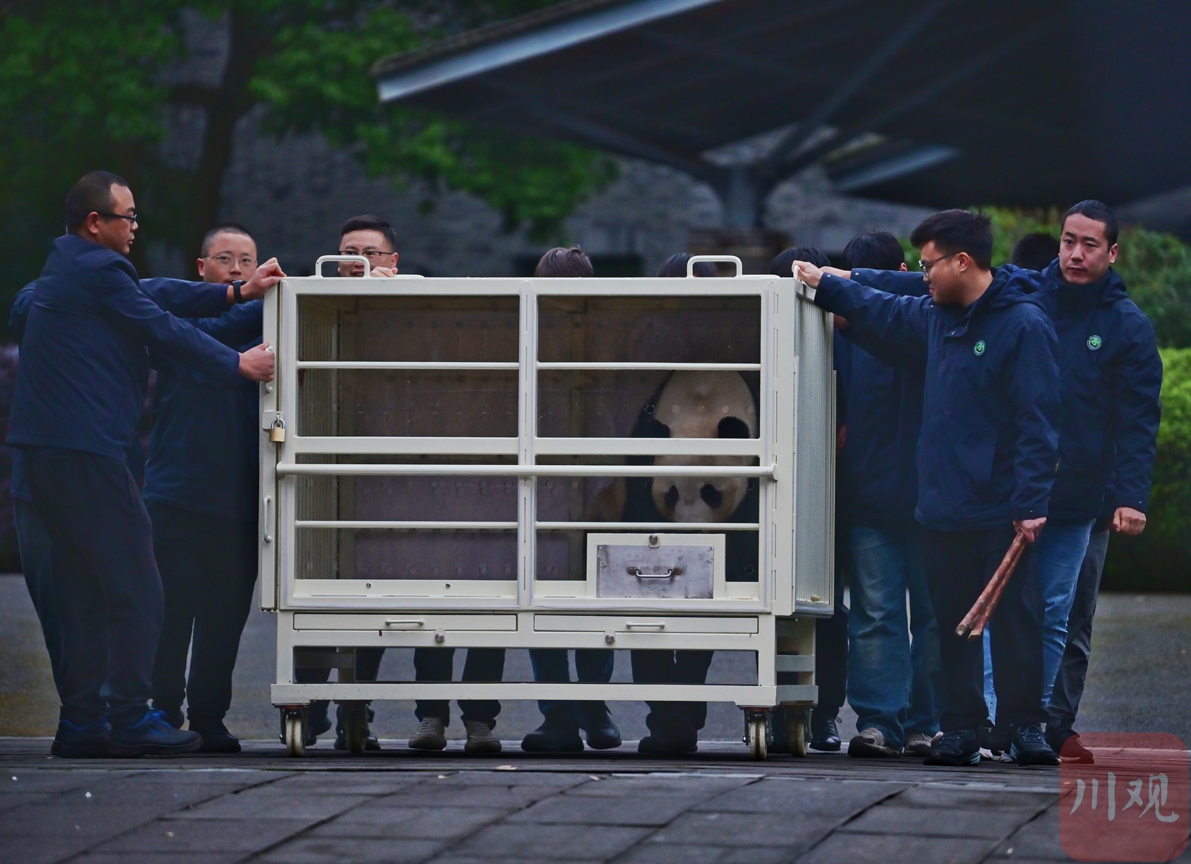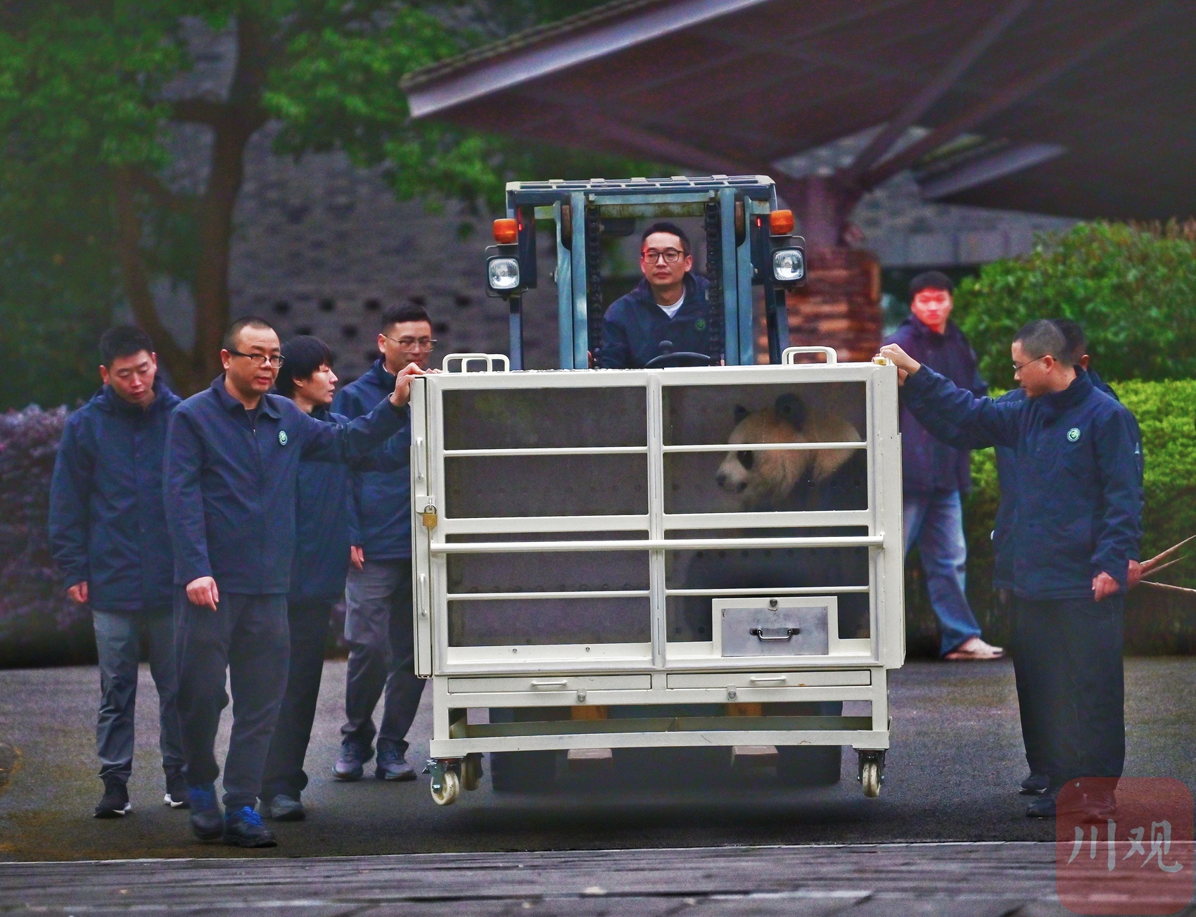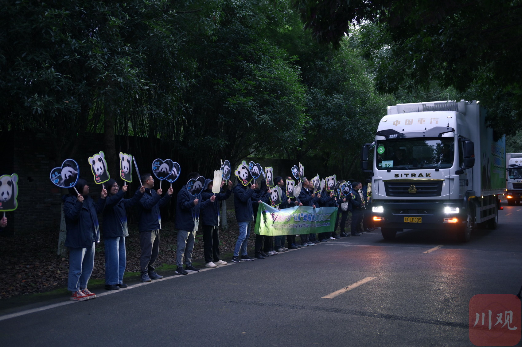 中国大熊猫保护研究中心的工作人员欢送大熊猫出发。