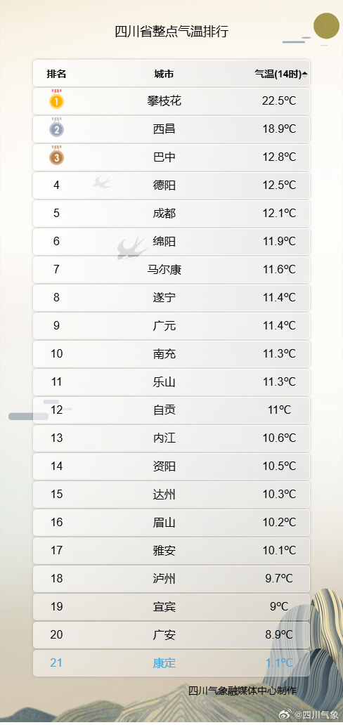 在冷空气的招惹下,21个市州的气温走势今天表现不一:宜宾、眉山、泸州、甘孜的开场就是最高点,全天气温一路向下;南充、达州、广元、巴中、绵阳、遂宁、阿坝、凉山都走出了“低开高走”的格局;成都、德阳、乐山、内江、自贡、资阳、雅安全天在低位行走,仿佛要画一条昨天的平行线;攀枝花唱的是“昨日重现”;广安绕了好大一个弯,终于拉回到8℃上方。