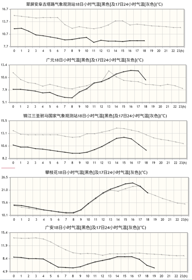 图中自上而下依次为2025年11月18日宜宾、广元、成都、攀枝花、广安的气温变化实况。