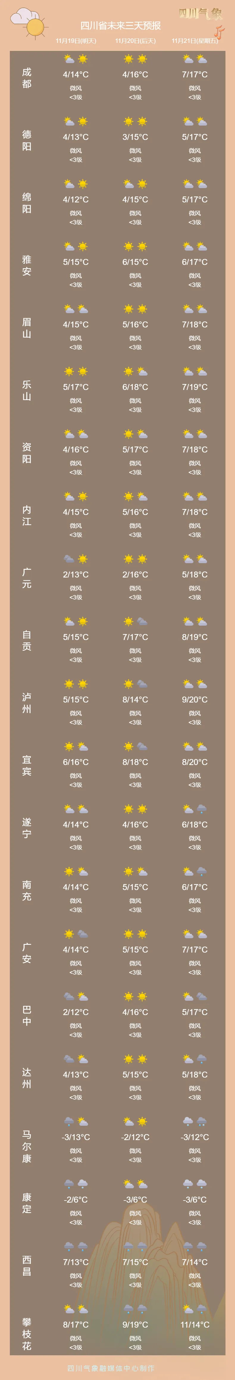 → 四川省气象台预计,19日早上,盆地北部最低气温将低至1~4℃,盆地其余地方最低气温4~6℃,昼夜温差大,早晚寒冷,需加衣保暖。有条件的朋友,建议晚出早归。
