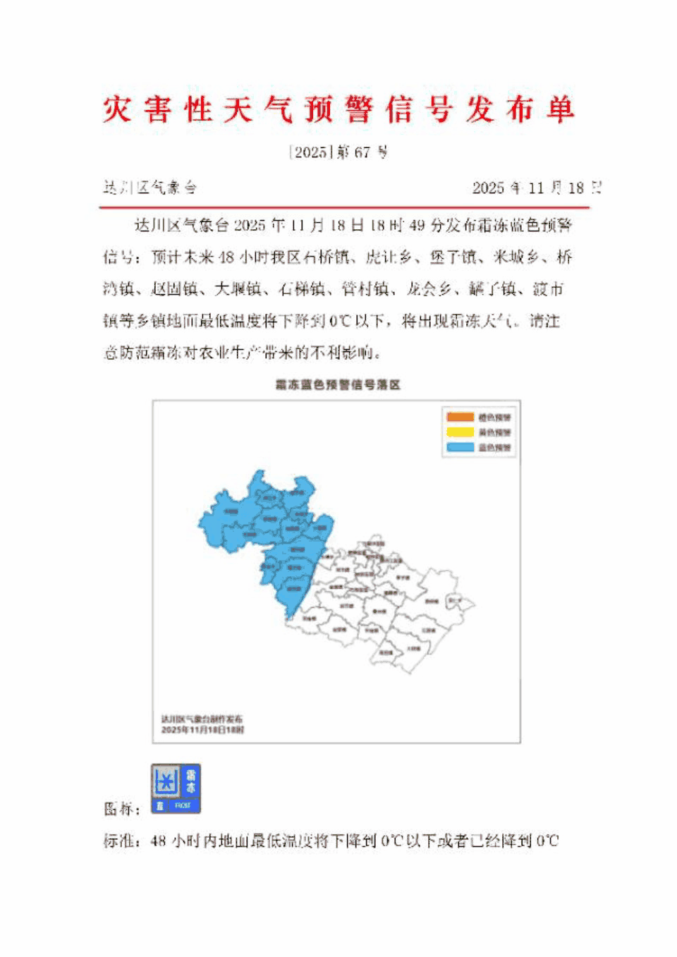 达川、宣汉、绵竹发布霜冻蓝色预警信号;泸定、美姑、宣汉、万源发布道路结冰黄色预警信号;若尔盖、石棉发布大风蓝色预警信号。