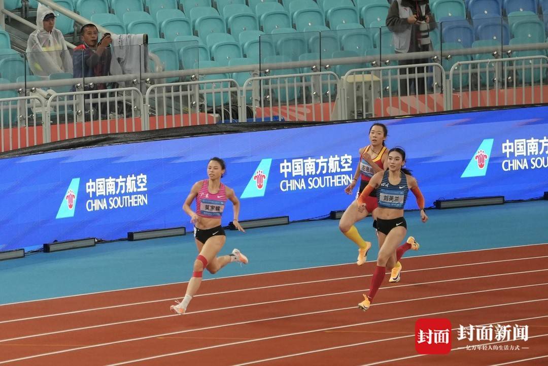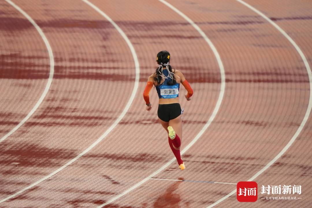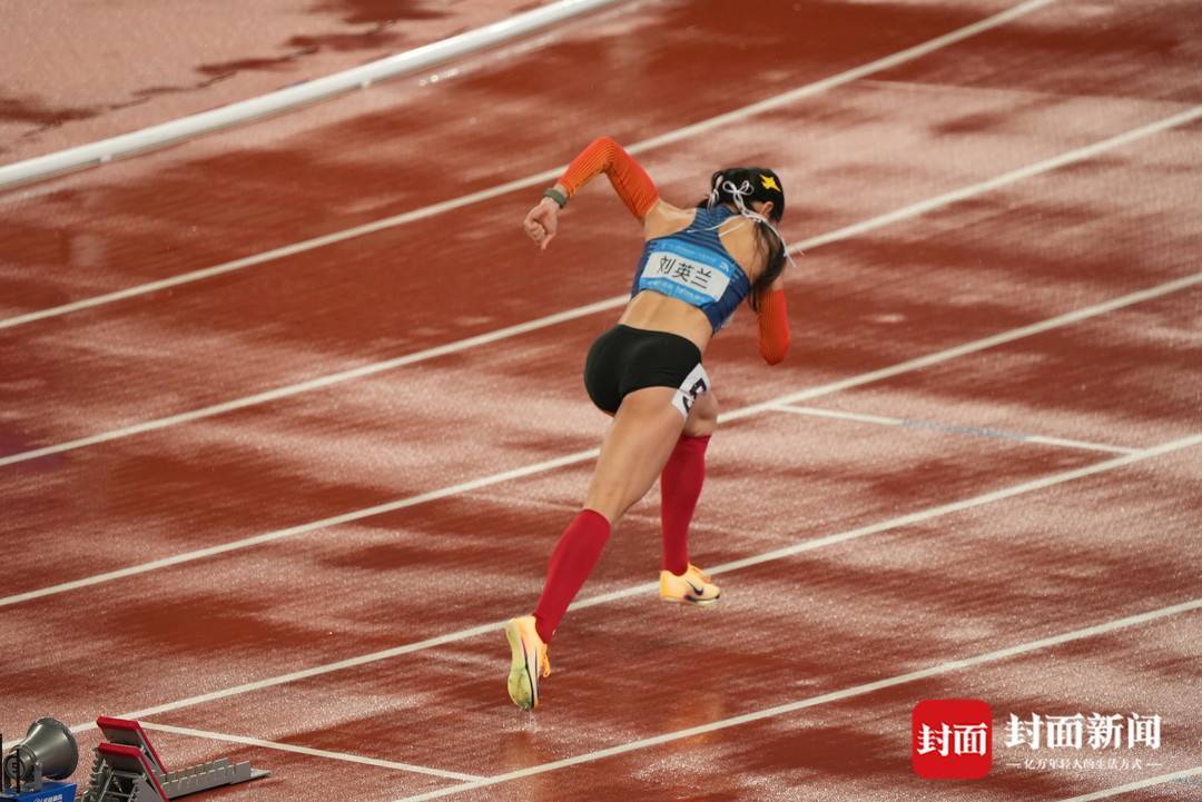 女子400米决赛前,广州几乎“一夜入冬”,气温断崖式下降来到11度左右,热身时选手们都穿上了羽绒服。比赛时下着小雨,场地有些湿滑,不过雨战从来不影响刘英兰的发挥,她在200米过后就展现出强劲的弯道实力,最终在进入直道后刘英兰依然有冲刺的能力,在最后30米左右奠定胜局。