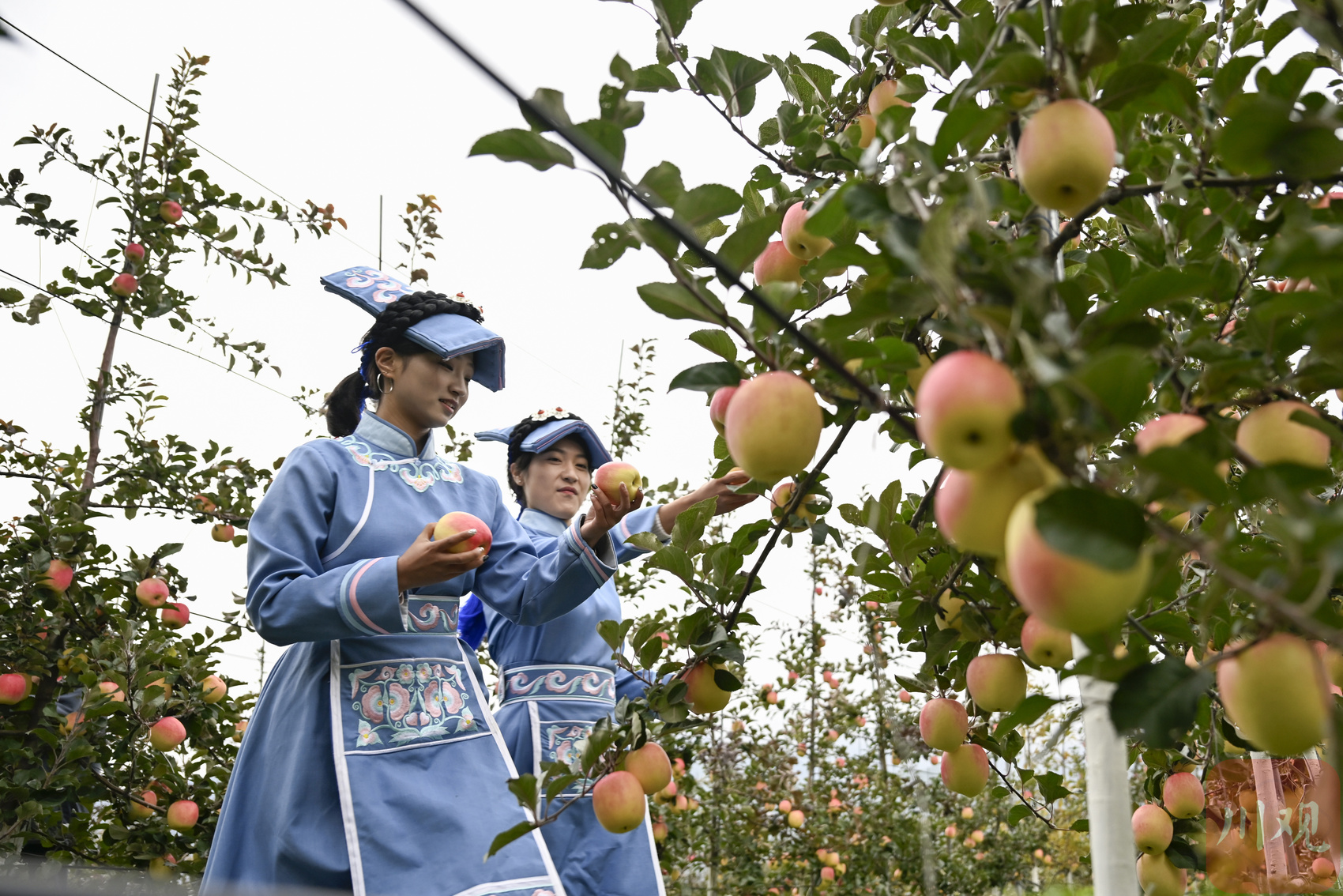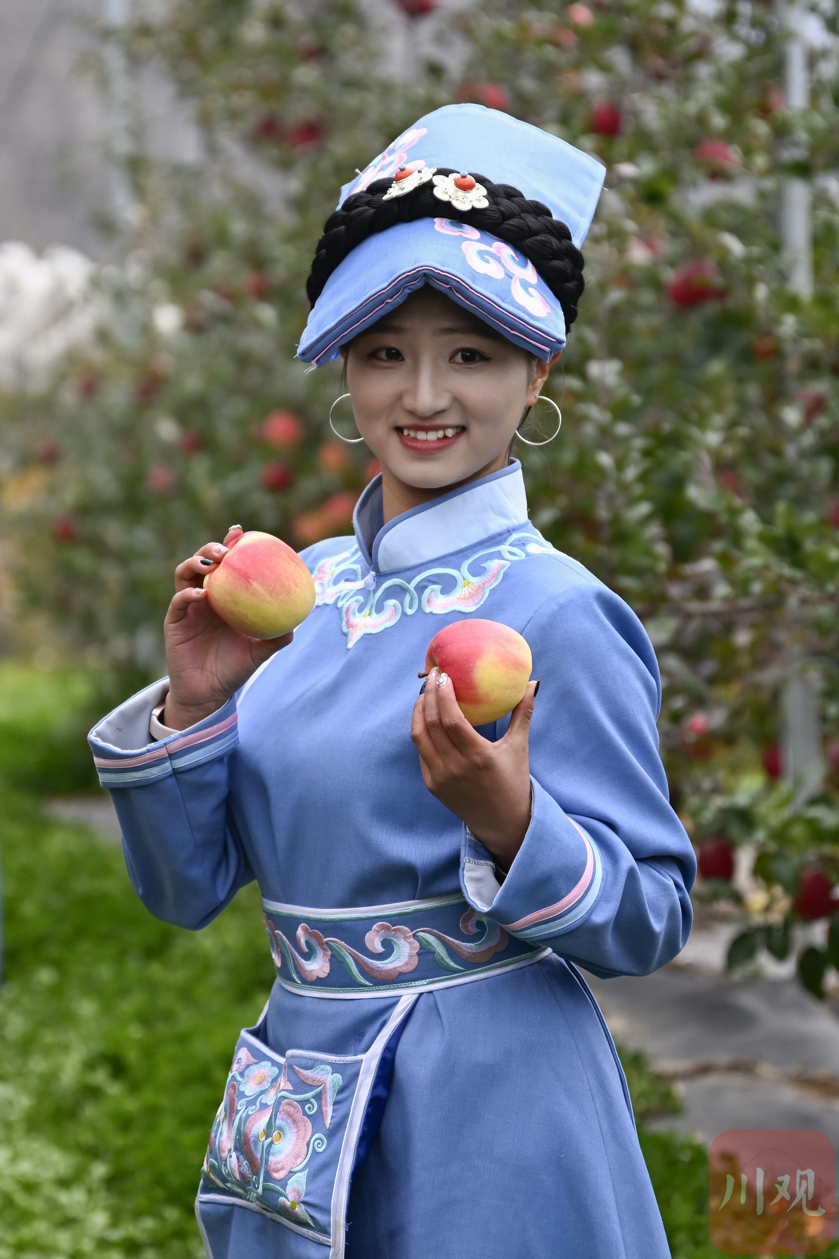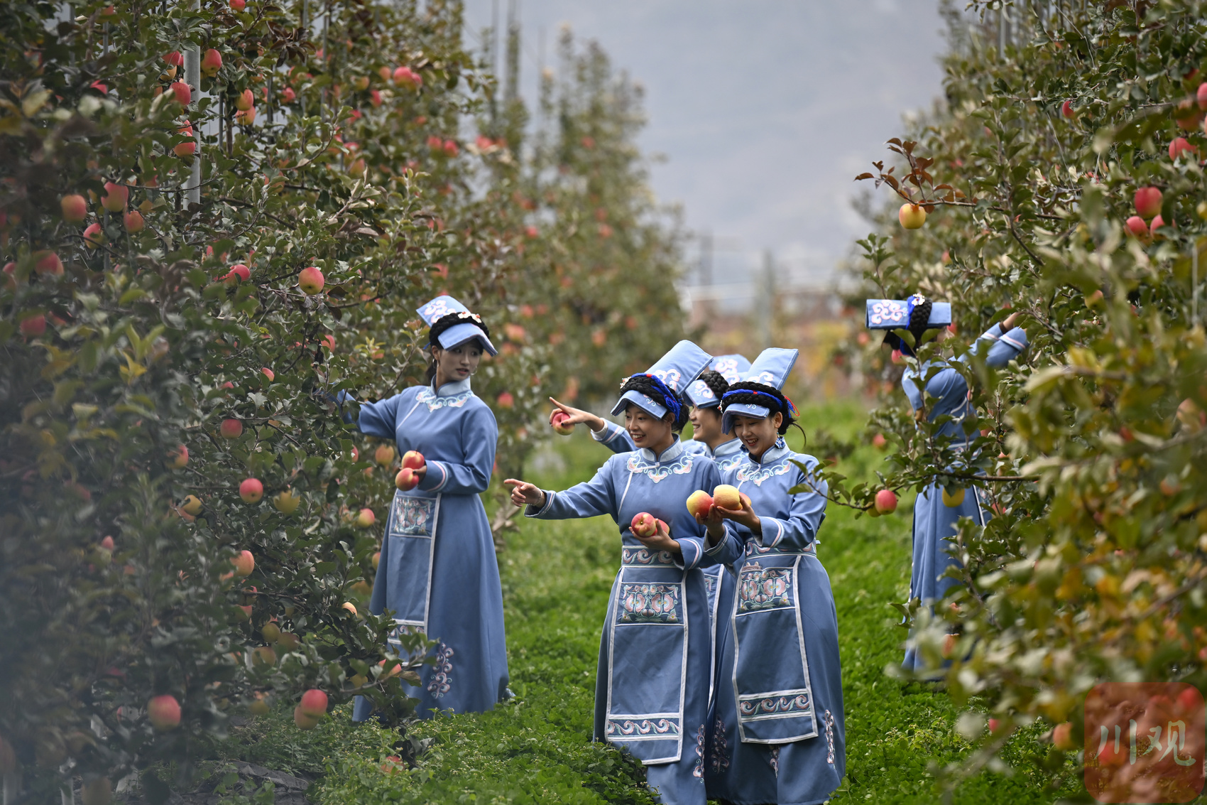 11月18日下午,茂县凤仪镇坪头村的苹果园里,身着羌族传统服饰的游客正穿梭于果树之间,体验亲手采摘的乐趣。