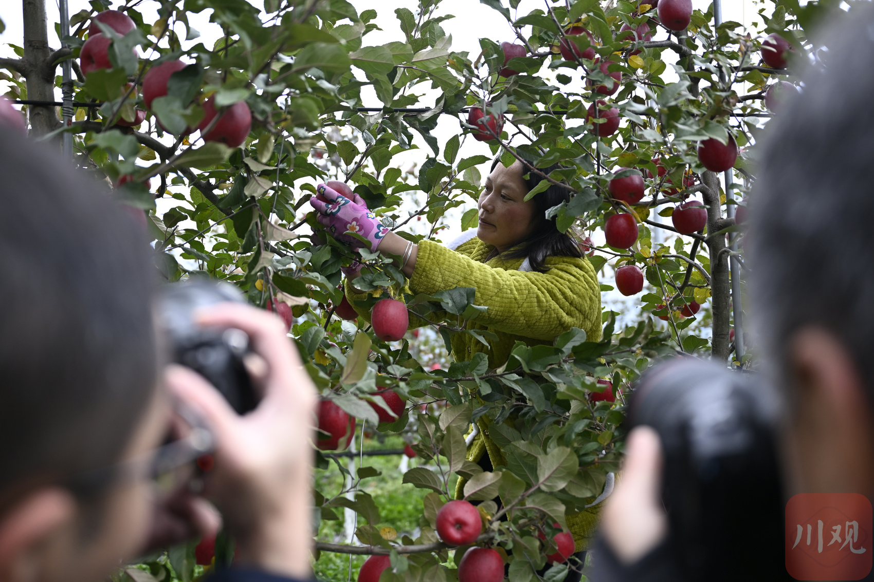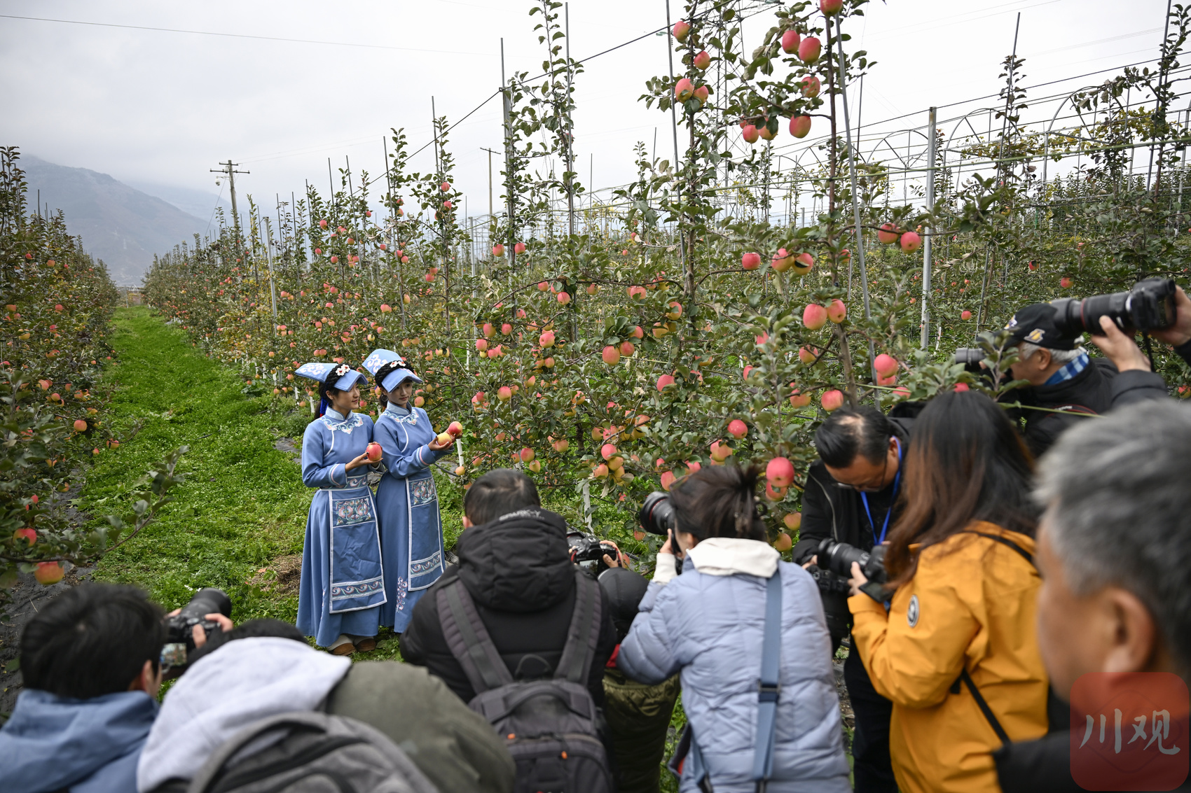 11月18日下午,茂县凤仪镇坪头村的苹果园里,一群身着羌族传统服饰的游客正穿梭于果树之间,体验亲手采摘的乐趣。
