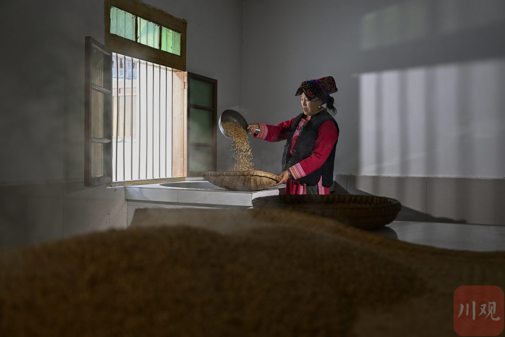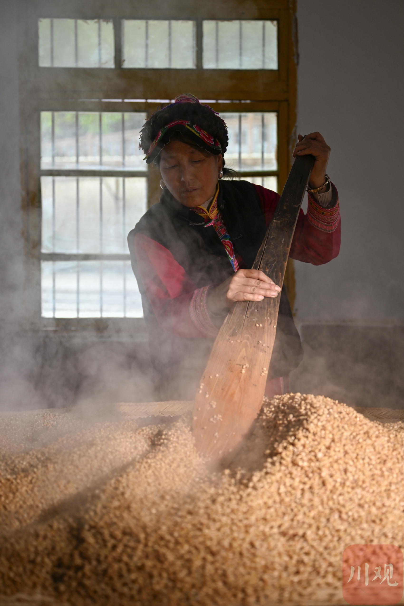 11月18日上午,茂县赤不苏镇,羌族群众正在制作传统特色的丰收酒“咂酒”。