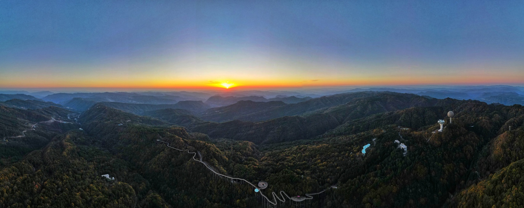 日落时分,在橘红色日光照耀下,景区内2万亩彩林格外耀眼,红枫、乌桕、银杏等林木褪去翠绿换上五彩盛装,宛如大自然打翻的调色盘,构成一幅独具浪漫的巴山初冬画卷。摄影师们登上海拔1520米的观景台将美景收入囊中。