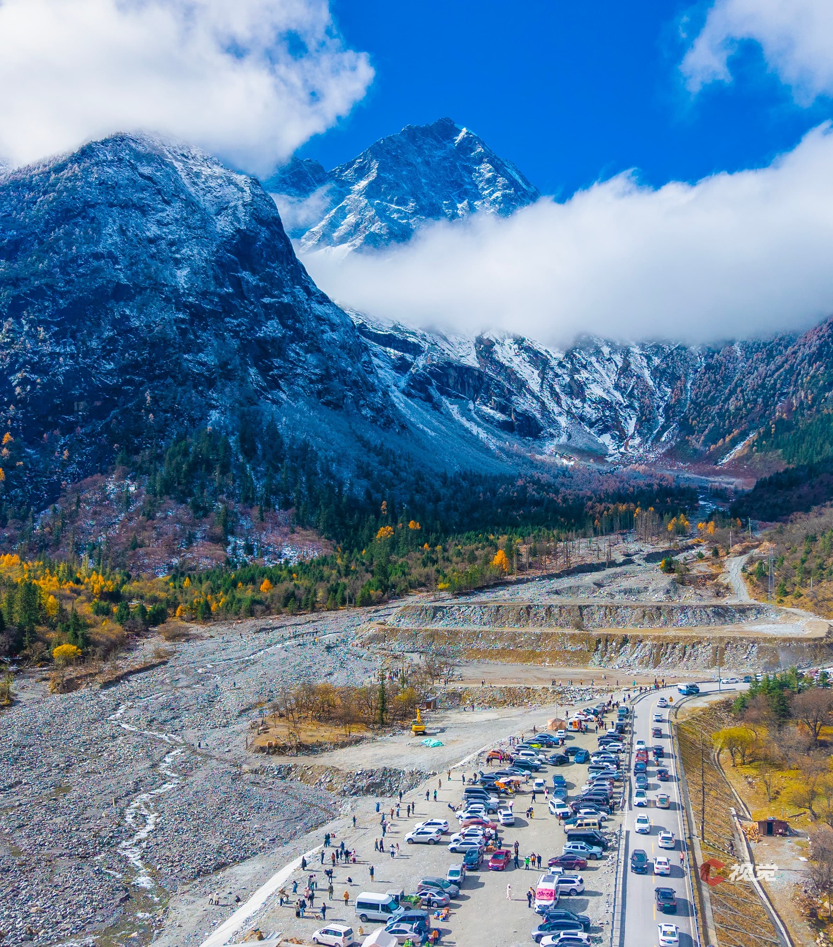 阿坝州理小路上的雪山云雾缭绕,山脚下的停车区已诸多前来追山的游客。C视觉签约摄影师 梁文华