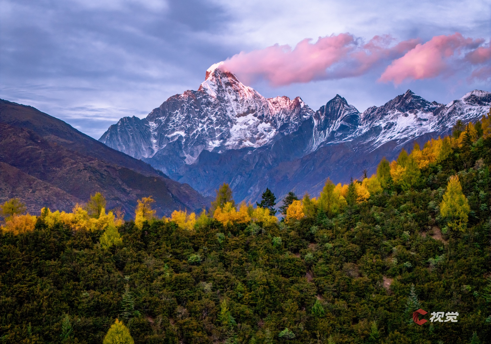 甘孜州甘孜县,海拔4798米的卓达拉雪山与山下的彩林相映成壮丽的画卷。C视觉签约摄影师 龙进文
