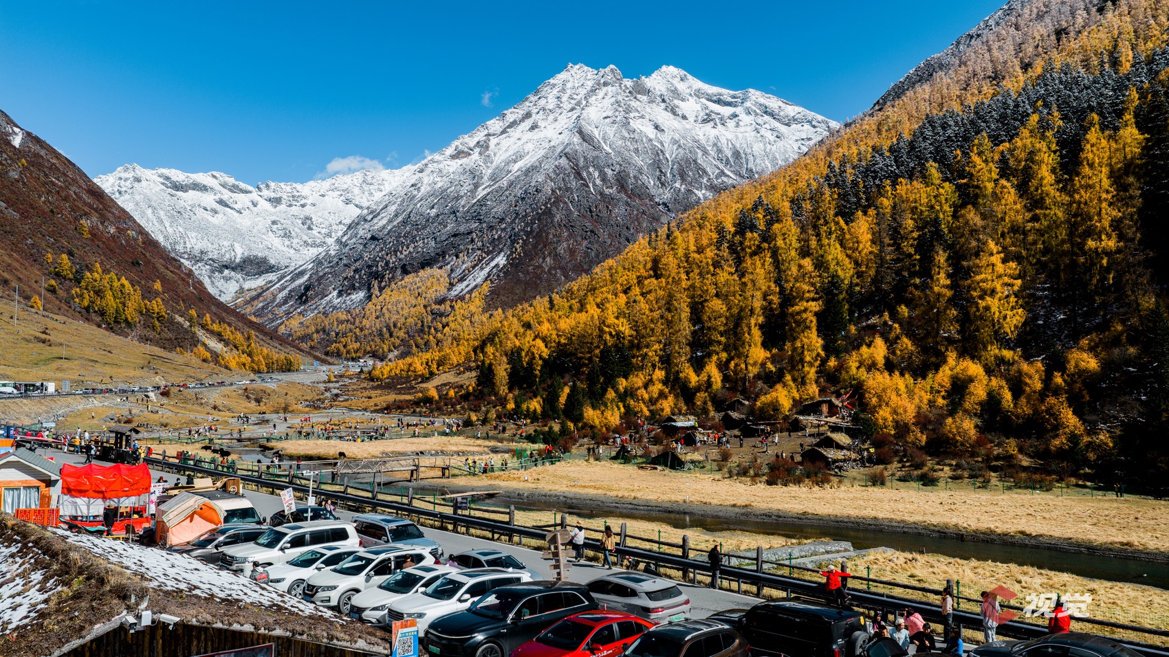 阿坝州理小路小金县段大二普营地雪后放晴,皑皑雪山与斑斓彩林相映成景,游客络绎不绝。C视觉签约摄影师 李旭