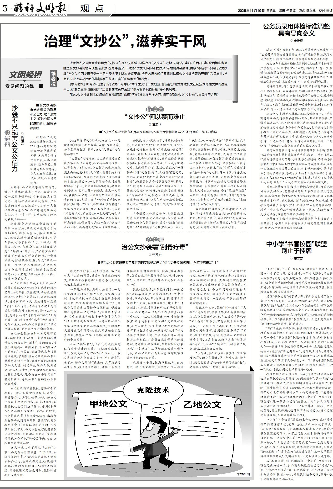 优化工作生态,推进“材料减负”。“文抄公”固然可憎,但板子不应全打在他们身上。在公文抄袭背后,也有基层写手挣扎于“文山会海”的影子。曾有乡镇干部向媒体诉苦,“一天要处理十几份文件,连细看材料的时间都没有,更别说认真去写了。”可见,推进“材料减负”也是整治公文抄袭的重要举措,这需要自上而下拿出“刮骨疗毒”的决心,远离“文牍主义”,持续精文减会,给基层减轻公文负担。
