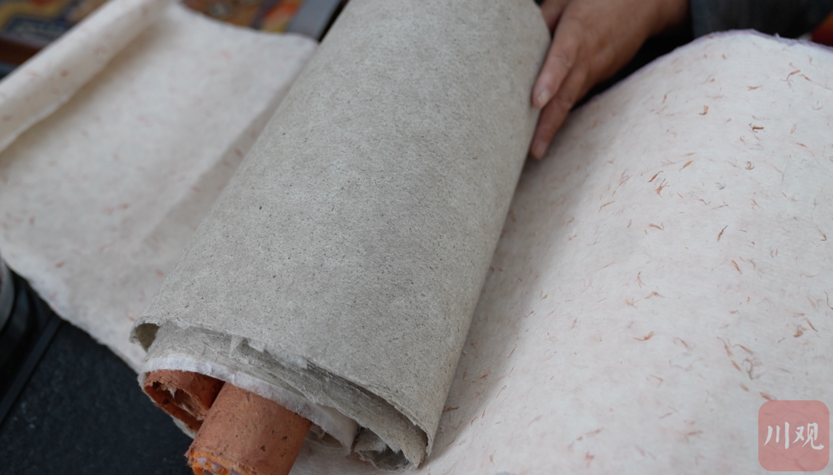 11月18日,甘孜州德格县非遗工作室里,德格藏纸非遗代表性传承人充巴向记者展示她的新作品。她手中那张纹理质朴、韧性十足的藏纸由牦牛粪和狼毒草为核心原料制成。纸张不但没有预想中的异味,而且飘着淡淡的青草香。