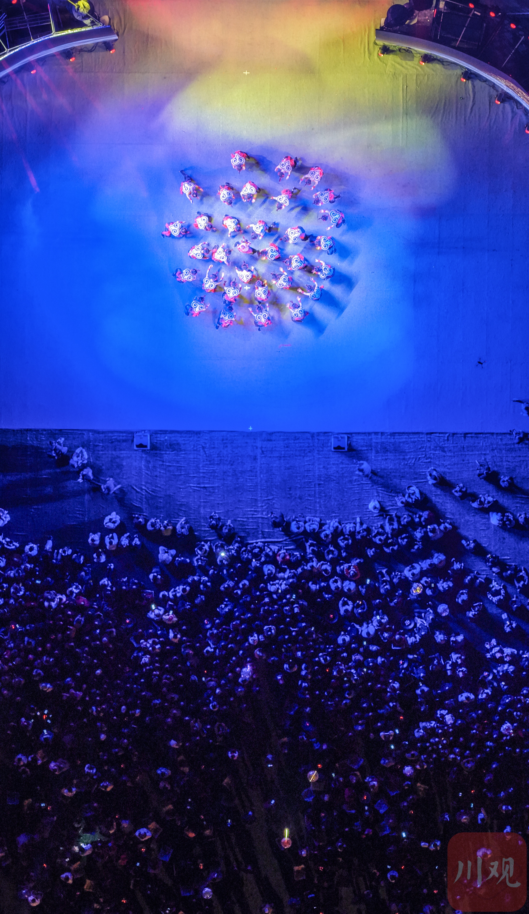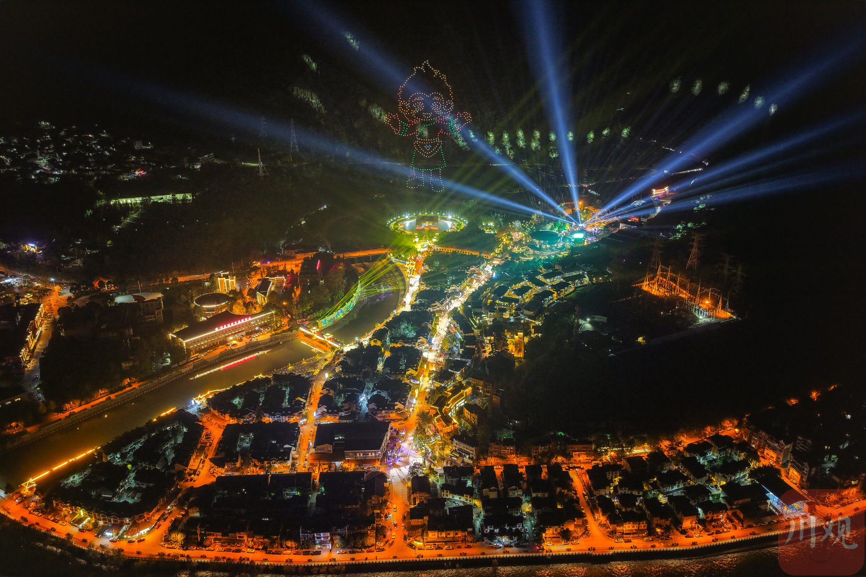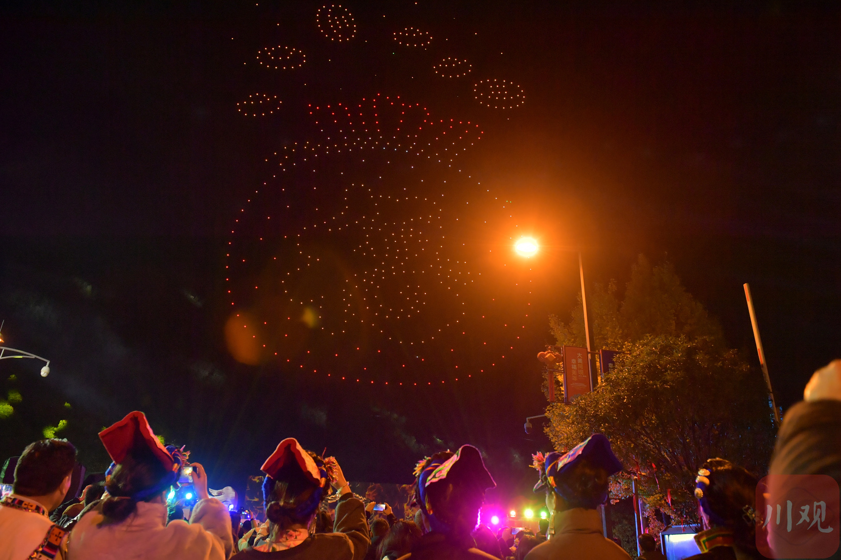 2025年11月18日,在四川省阿坝州汶川县映秀镇,当地群众通过观看无人机表演迎接羌历新年的到来。