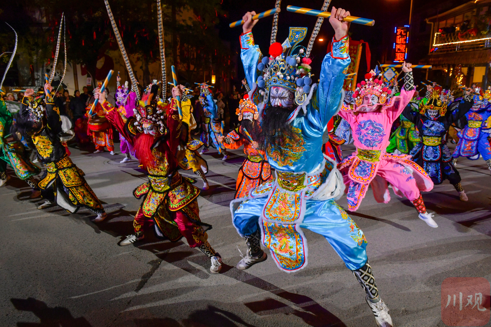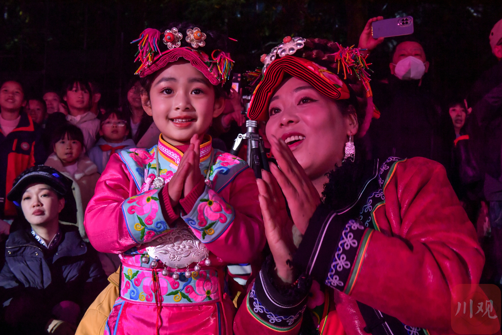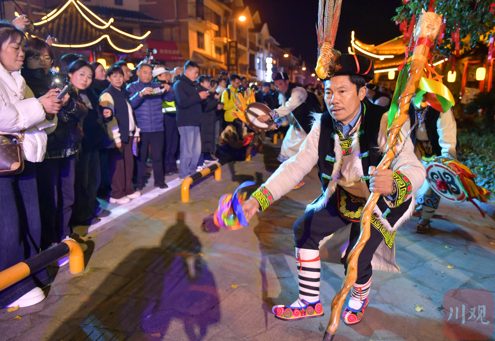 2025年11月18日,在四川省阿坝州汶川县映秀镇街头,当地群众纷纷走出观看表演和夜景庆祝羌历新年的到来,现场热闹非凡。