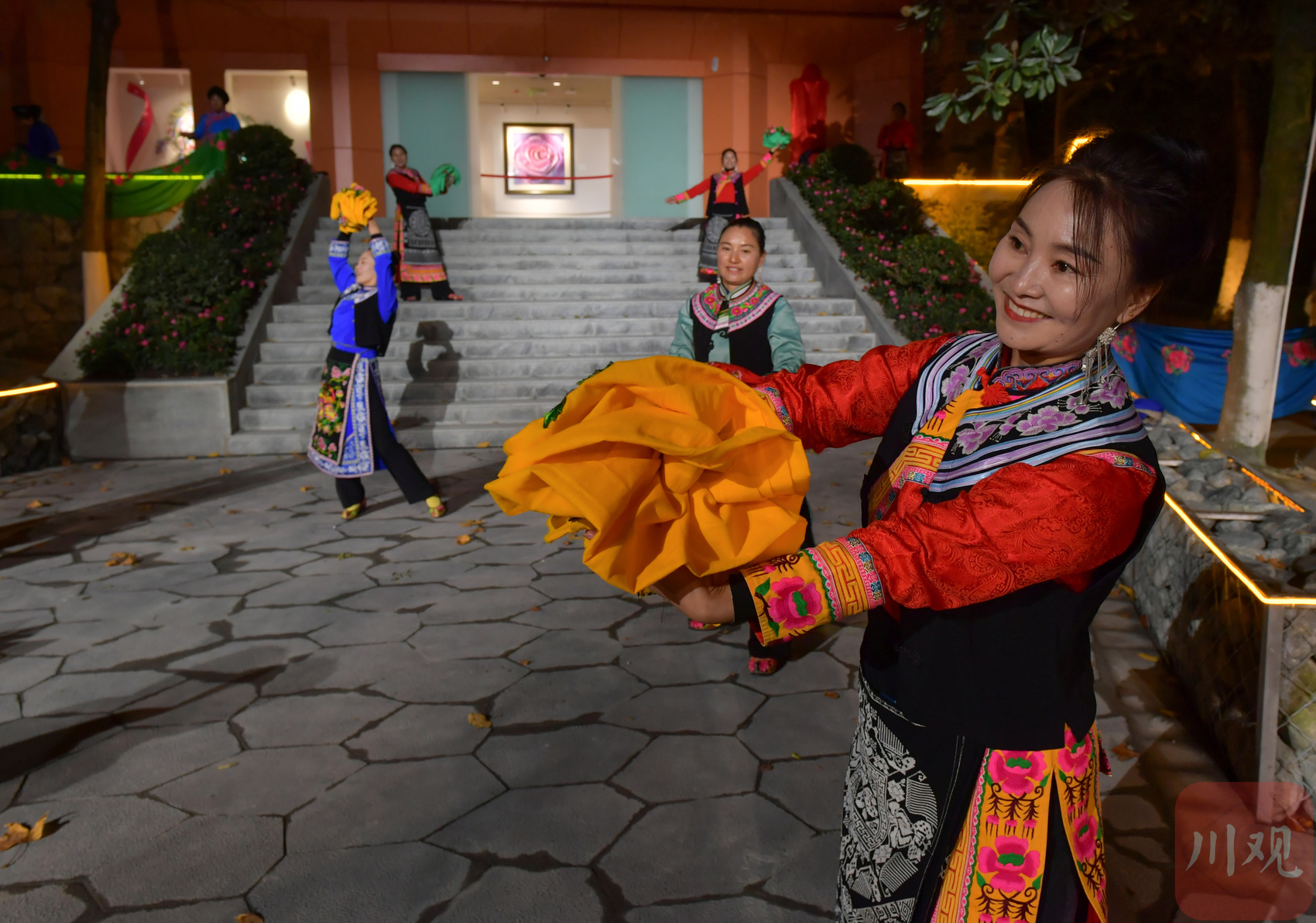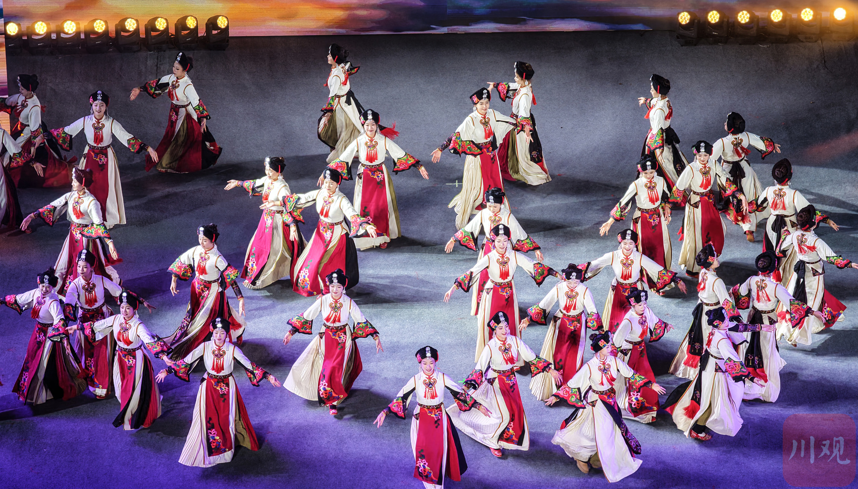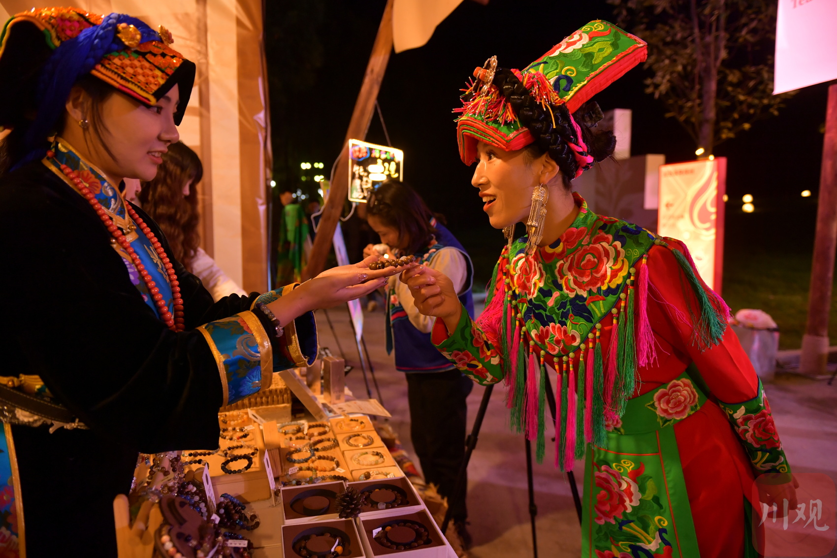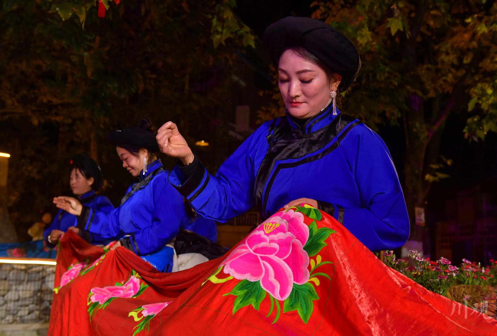据了解,本次夜游活动设置了两条核心线路、一个非遗集市和一场特色晚会,串联起映秀镇多个文化节点。映秀大桥上,羌红与光影交相辉映;桥对岸,打铁花、火符演绎尽显民族风情,悠扬羌笛萦绕耳畔;阳台小剧场内,羌族姑娘身着盛装,跳起瓦尔俄足节专属的沙朗舞;172米长的《大熊猫百图唐卡长卷》通过光影技术“活”态呈现,羌族多声部民歌《云岭羌音》奏响听觉盛宴;凉亭内展示的羌族剪纸、藏族书法,更展现出非遗“见人见物见生活”的鲜明特质。