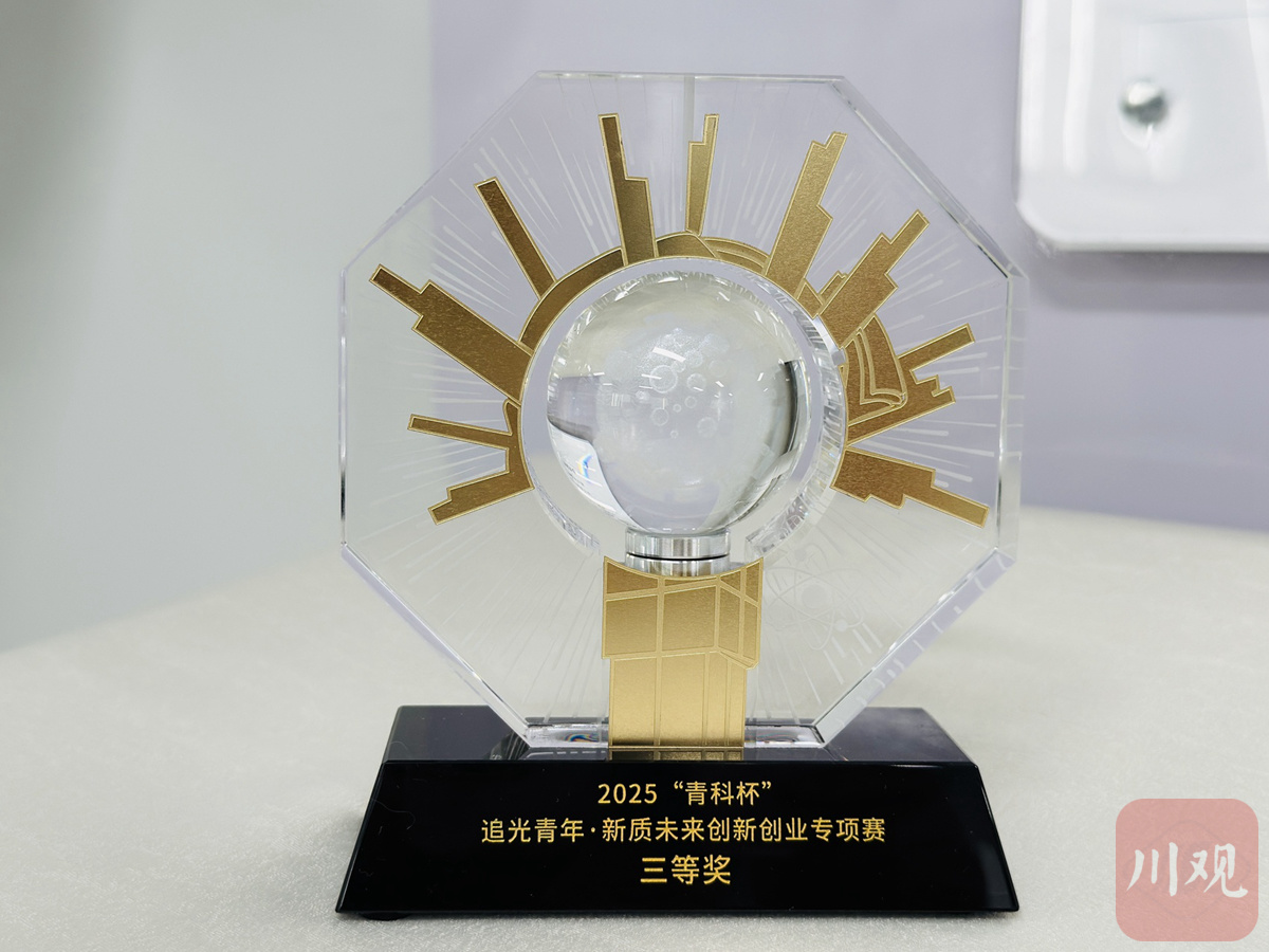 实验室里有一张照片,马旺和其他团队代表一同站在领奖台上。这是2025年9月,他们获得“青科杯”三等奖的领奖时刻。