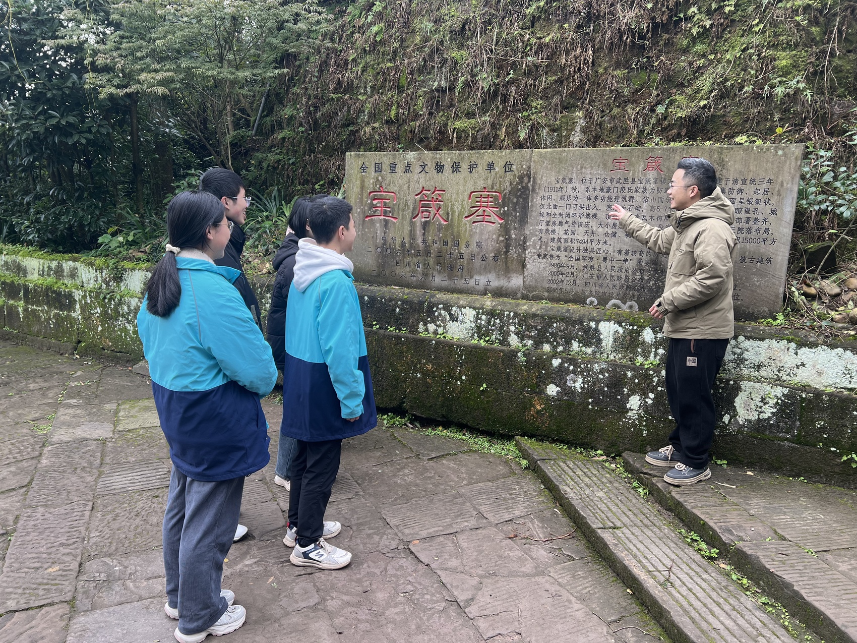 在龙女湖中学老师的引导下,学生们仔细观察了宝箴塞“两端宽阔、中间狭长”的整体布局。来自龙女湖中学的学生结合所学,分析了军事建筑的防御原理;宝箴塞初中的学生则娓娓道来段氏筑塞的历史渊源。双方学子实地查看东塞的垛口形射击孔、西塞的“内八字形”射击孔以及回廊式炮楼,共同探讨其设计巧思。