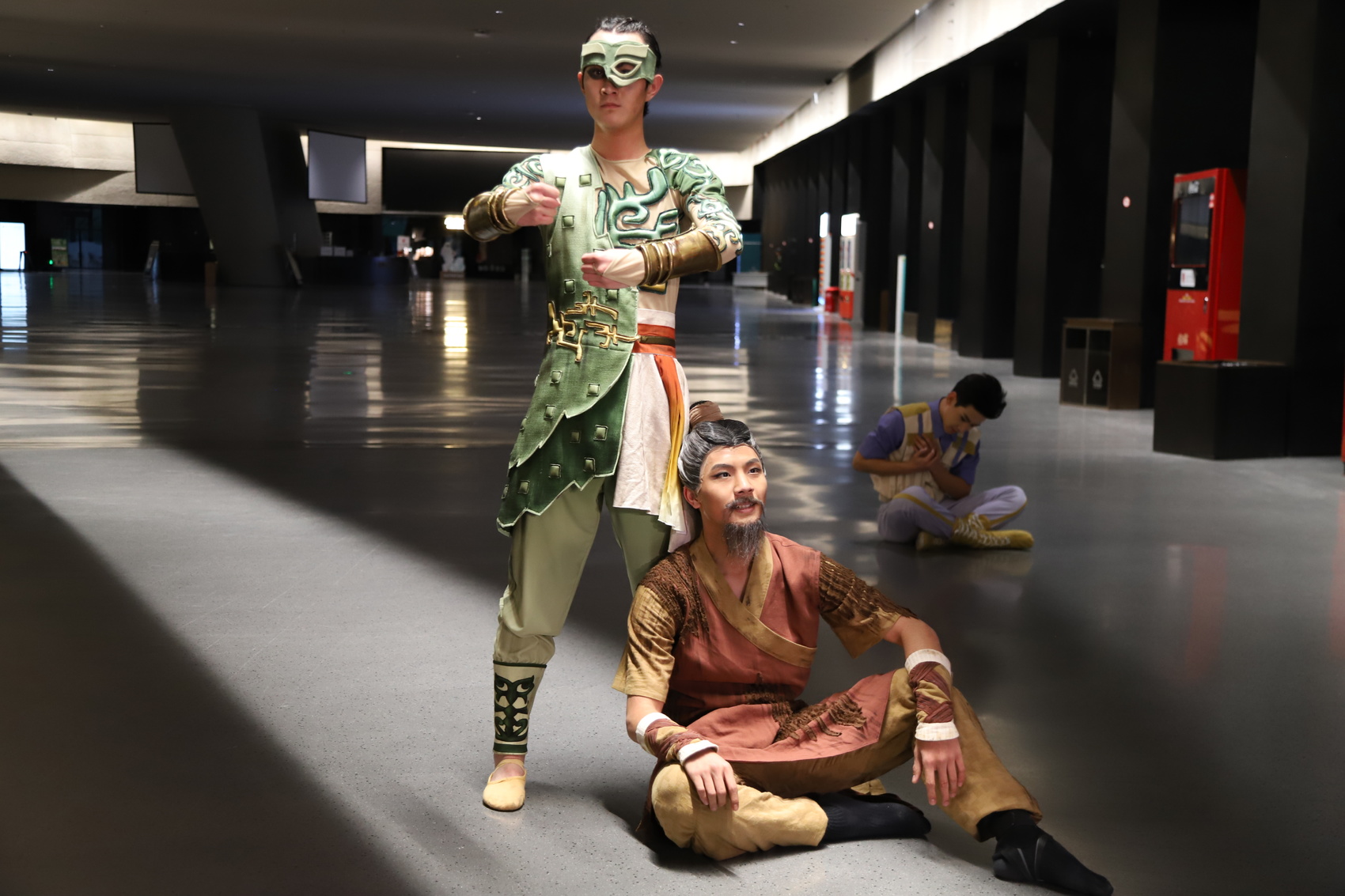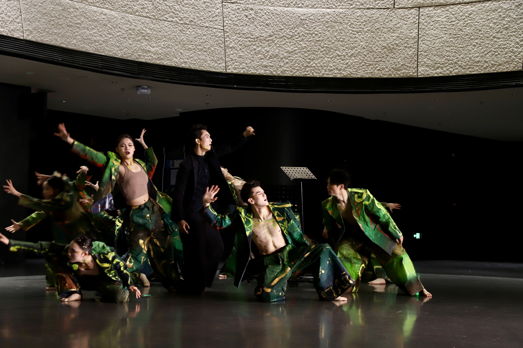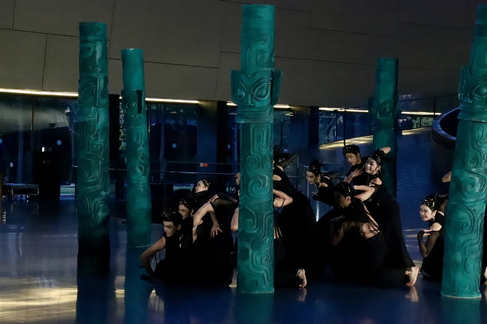 随后,在舞者的引导下,观众移步室内,开启又一段视觉奇旅。博物馆大厅的旋转楼梯上,青铜神柱拔地而起,宛如贯通天地的时光之轴——舞蹈《垂直纪元》在此上演。舞者们仿佛自远古的青铜纹路中缓缓走来,肢体语言时而刚劲如铸,时而飘逸似云,既诉说着古蜀先民的智慧与坚韧,也重现着三星堆曾有的辉煌与荣光。