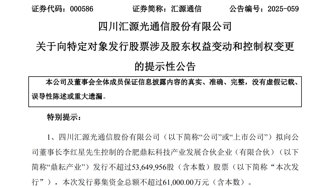 11月18日晚间,四川汇源光通信股份有限公司(证券简称“汇源通信”)发布公告称,拟向公司董事长李红星控制的合肥鼎耘科技产业发展合伙企业(有限合伙)(下称“鼎耘产业”)发行不超过5365万股(含本数)股票,发行价格为11.37元/股,本次发行募集资金总额不超过6.1亿,扣除发行费用后的募集资金净额拟全部用于补充流动资金。