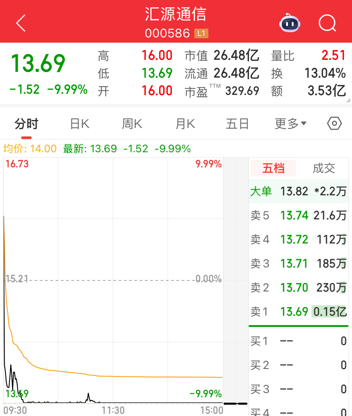 11月19日,汇源通信股票复牌即跌停,截至下午收盘,报13.69元/股,总市值26.48亿元。