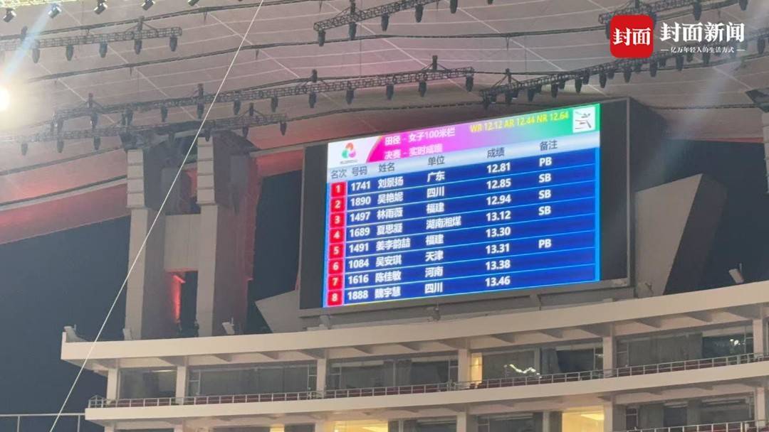 11月19日,第十五届全运会田径项目的比赛继续在广州奥体中心举行,在压轴的女子100米栏决赛中,四川选手吴艳妮以12秒85的成绩摘得银牌。广东选手刘景扬爆冷12秒81夺冠。