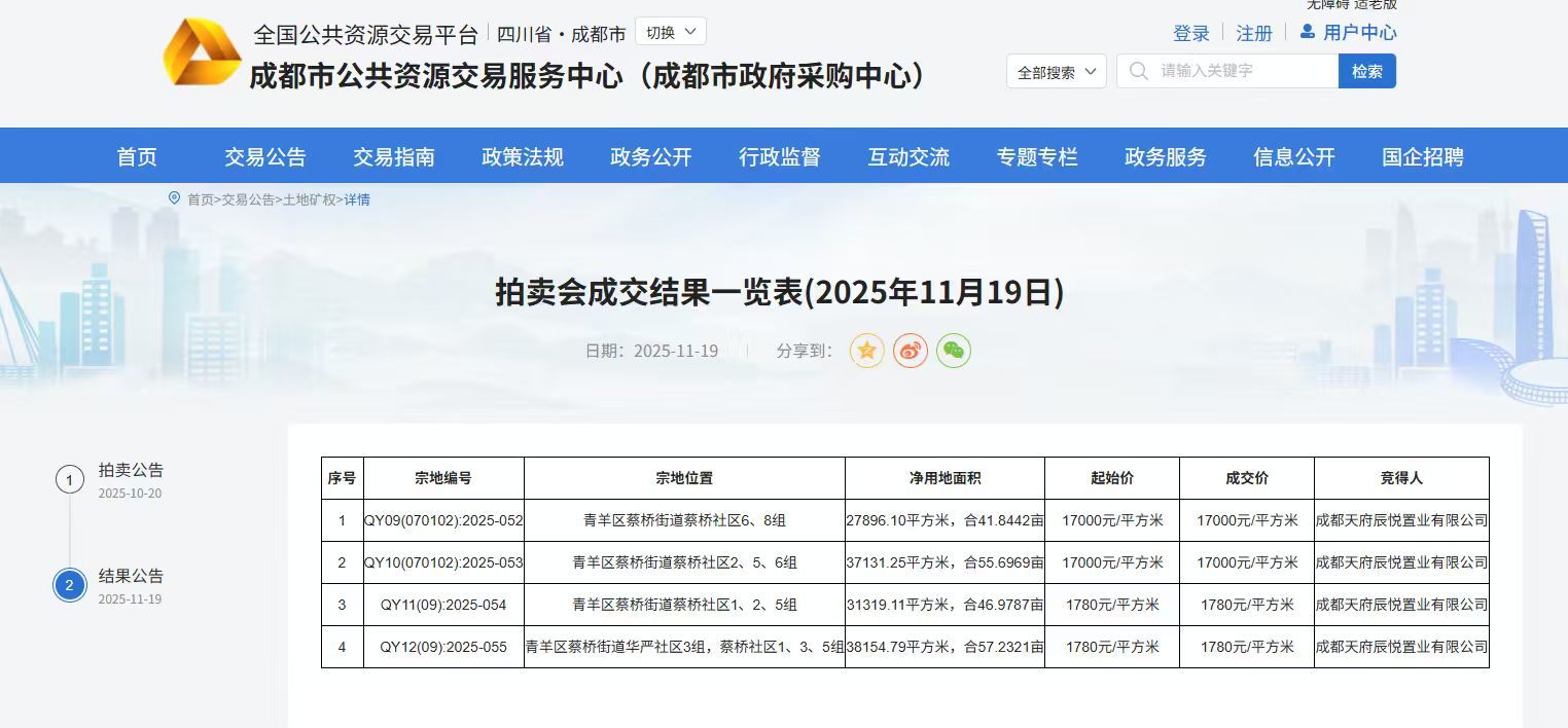 11月19日,成都市公共资源交易服务中心以拍卖方式组合供应4宗国有建设用地使用权,中粮大悦城旗下的成都天府辰悦置业有限公司参与竞拍并成功斩获全部4宗土地使用权。