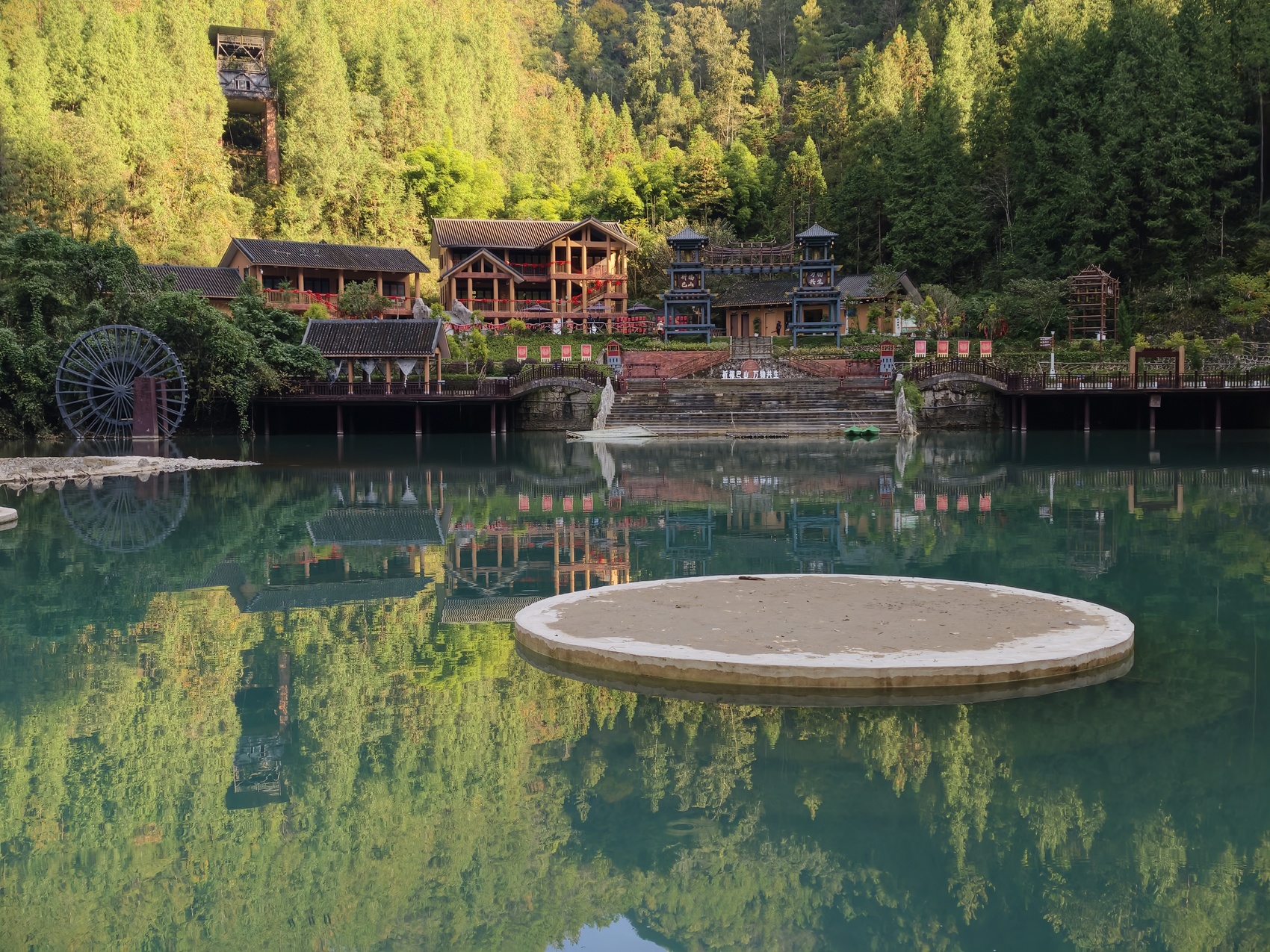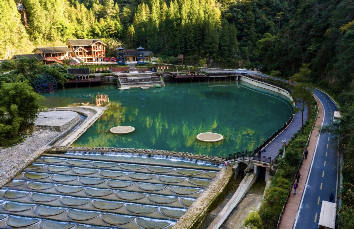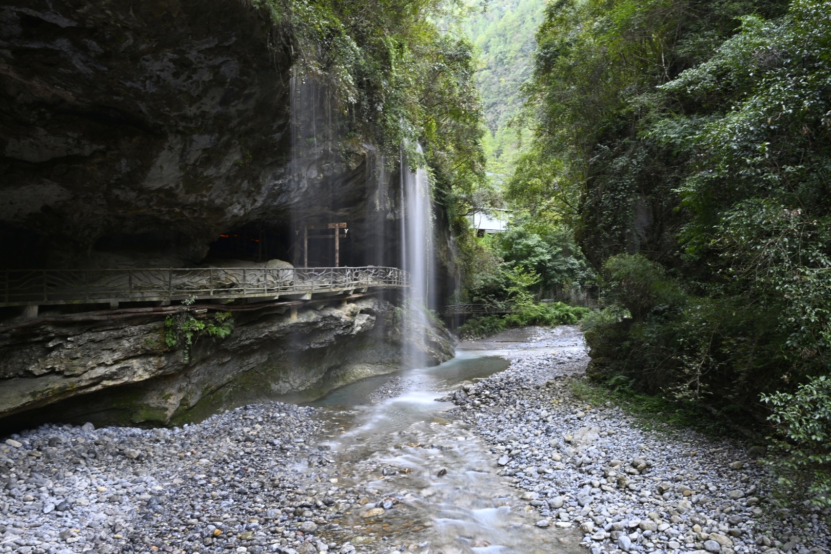 行走在栈道上,河里的石头排列有序,错落有致,溪水顺着石头顺流而下打在石头上,荡起阵阵的水雾。面对如画的景象,摄影师们举起相机,不停按下快门,想要留住这一刻眼前美景。
