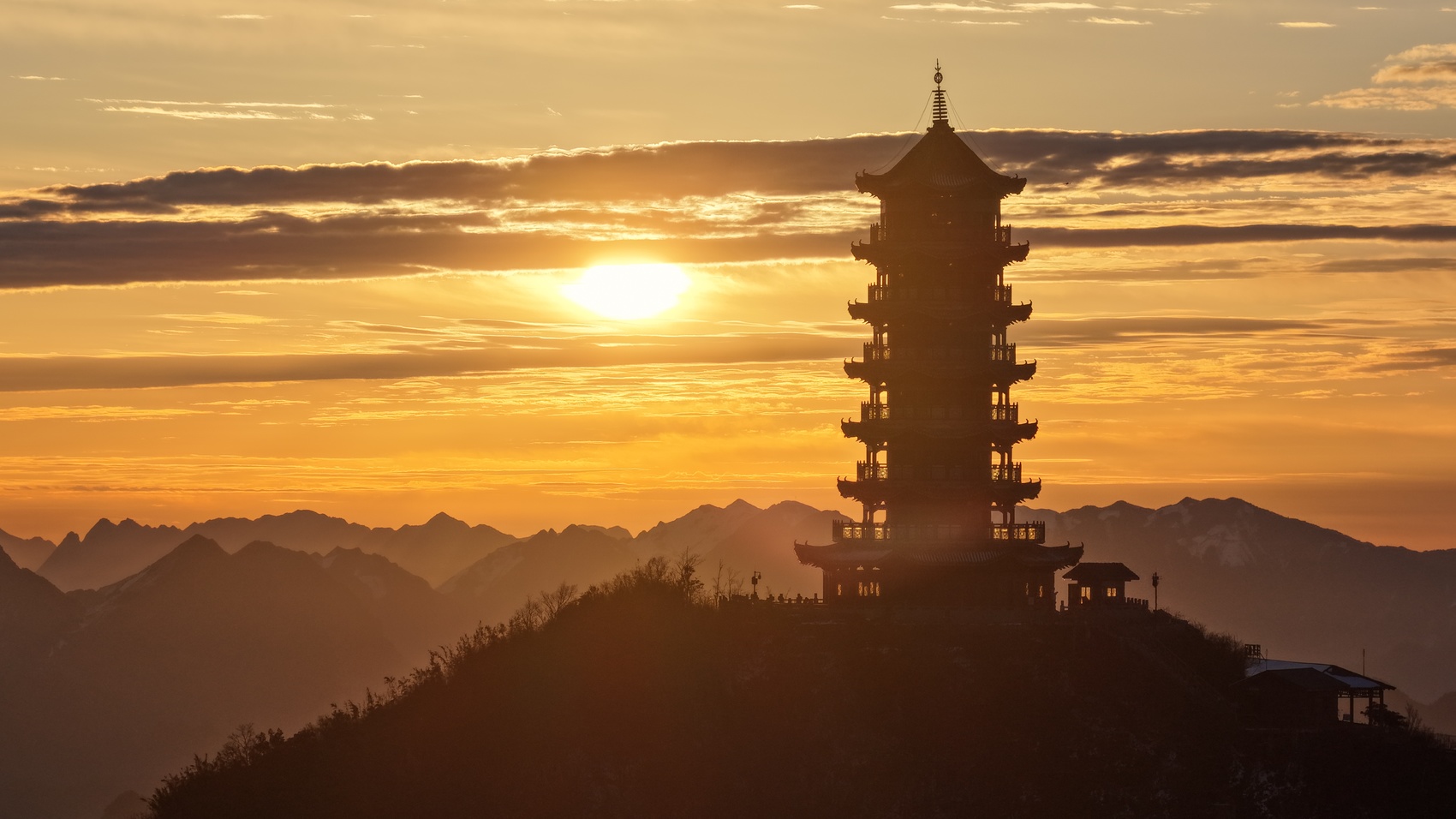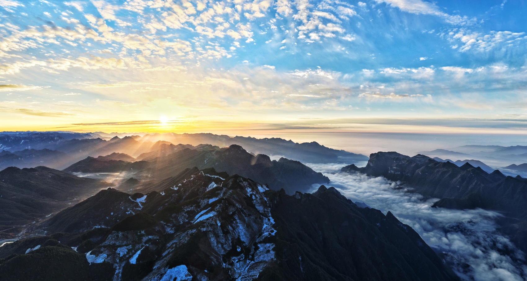 随着天际线由墨蓝逐渐转为鱼肚白,一道金色的细线悄然勾勒出远山的轮廓。突然,一束金光刺破云层,瞬间点燃了翻涌的云海,将其染成流金溢彩的熔岩之河。紧接着,太阳如同一个燃烧的火球,从云海边缘喷薄而出,跃上地平线,万丈光芒顷刻间洒满整个罗盘顶。