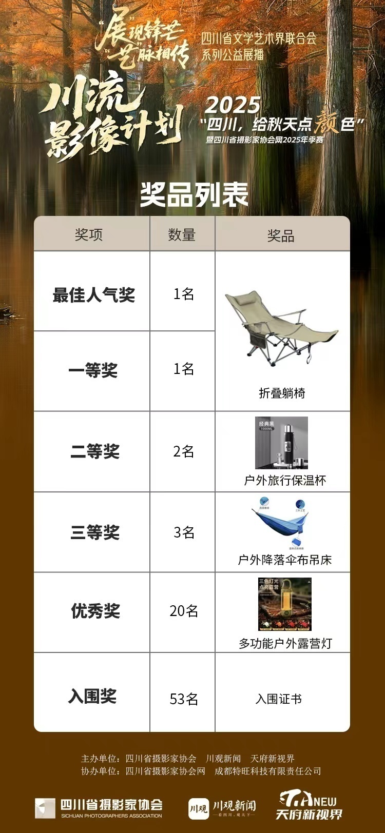 只要入围就有奖,最终排名前26的投稿作者将获得由成都特旺科技有限责任公司提供的户外器械,助力你户外拍摄安心创作;特别要提醒的是本次还专门设置了最佳人气奖1名。so,网络展播投票环节要多多努力哟!