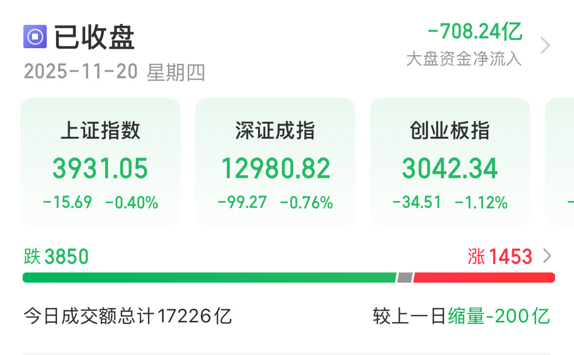 11月20日,A股三大指数再次集体回调。截至收盘,沪指跌0.40%,收报3931.05点;深证成指跌0.76%,收报12980.82点;创业板指跌1.12%,收报3042.34点。
