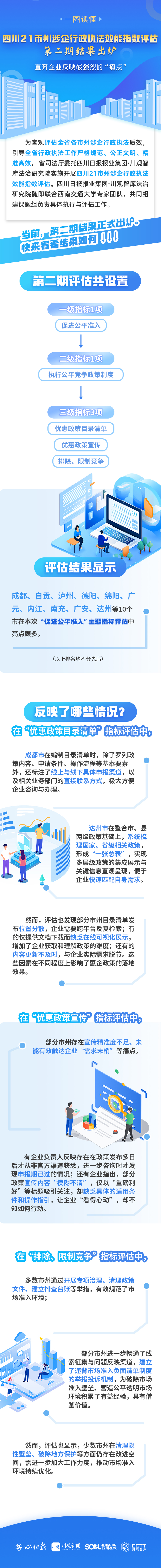 为客观评估全省各市州涉企行政执法质效,引导全省行政执法工作严格规范、公正文明、精准高效,切实提升企业满意度,省司法厅委托四川日报报业集团·川观智库法治研究院实施开展四川21市州涉企行政执法效能指数评估。四川日报报业集团·川观智库法治研究院随即联合西南交通大学专家团队,共同组建课题组负责具体执行与评估工作。近日,第二期结果正式出炉,结果显示,成都、自贡、泸州、德阳、绵阳、广元、内江、南充、广安、达州等10个市在本次“促进公平准入”主题指标评估中亮点颇多。