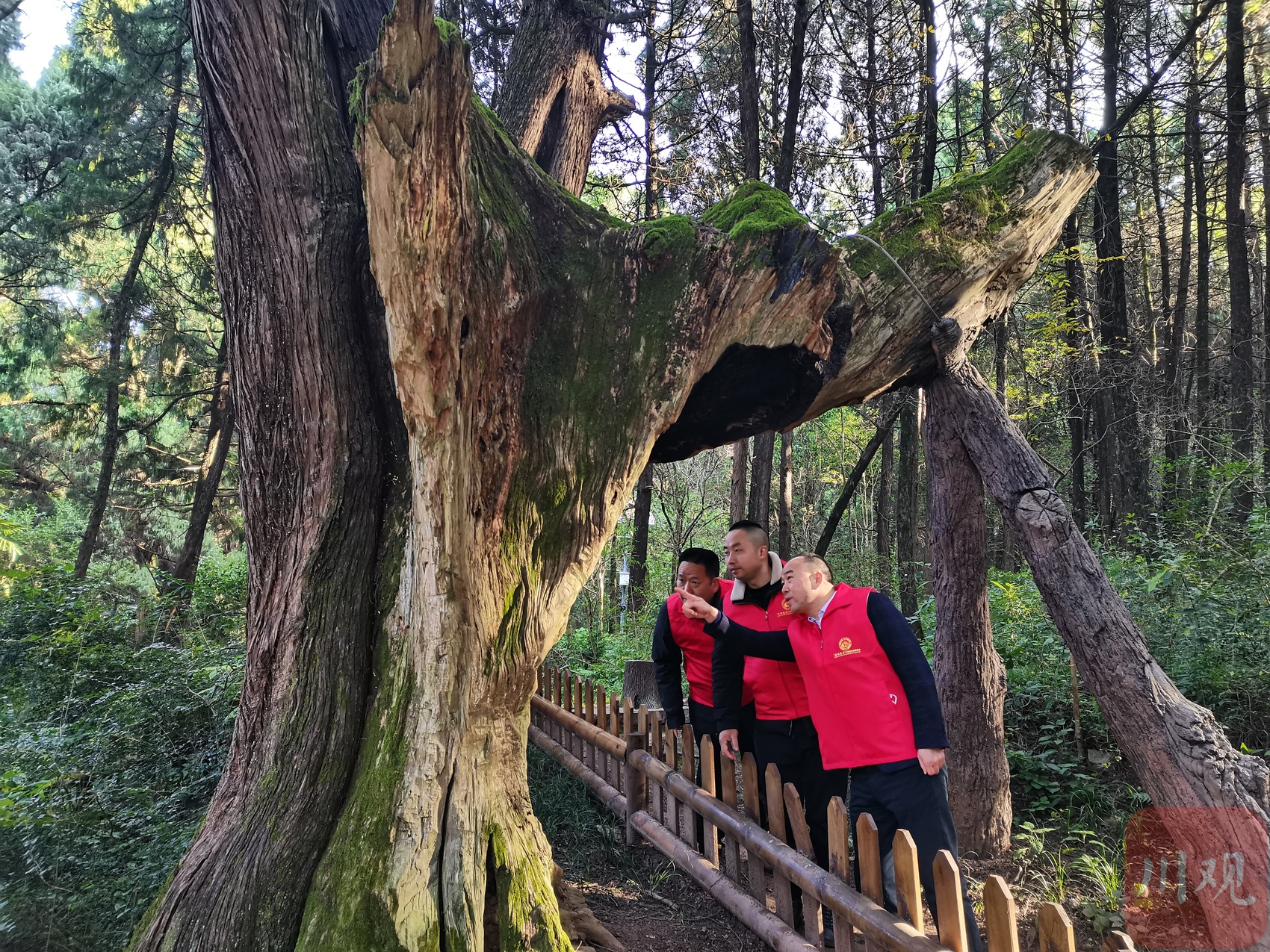 人群中,三名身穿红马甲的巡逻人员在古柏间穿梭忙碌,认真查看古柏的保护情况,并记录巡护情况,“保护牌完好、灭火设施完好、古柏生长态势正常……”而他们身上红马甲印着的“‘剑阁老兵’古柏保护志愿服务队”字样格外醒目。