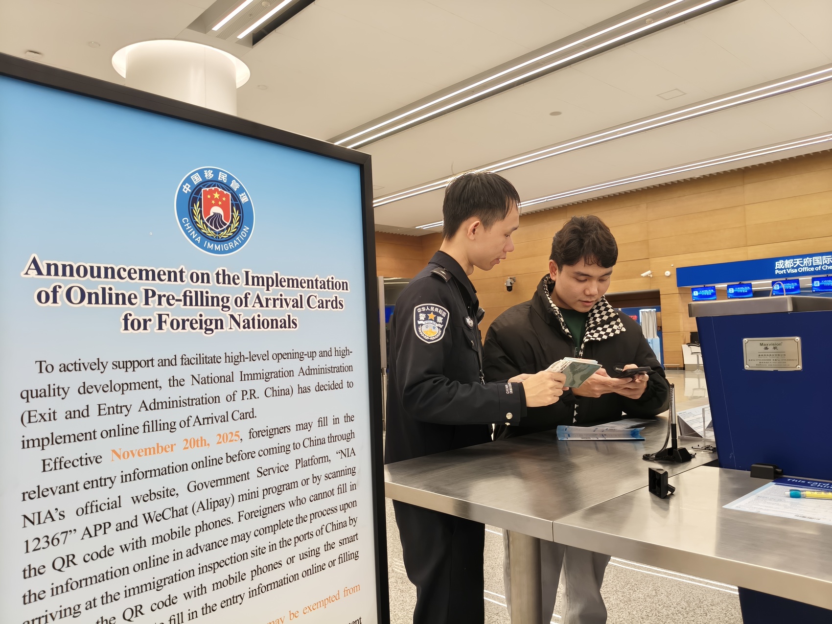 成都边检站相关负责人介绍,对于不具备网上填报条件的外国人,可在抵达中国口岸出入境边防检查现场时,通过手机扫描入境卡填报码或使用现场智能设备在网上填报入境信息,也可依然采用传统方式填写纸质外国人入境卡。