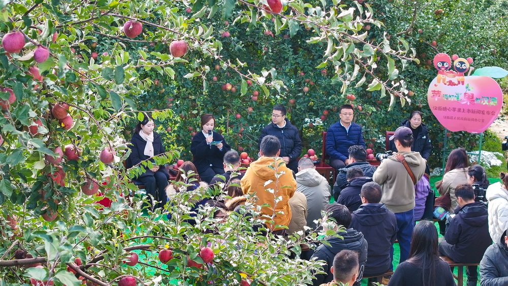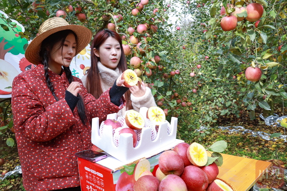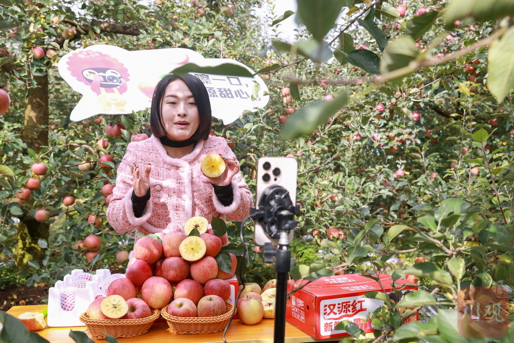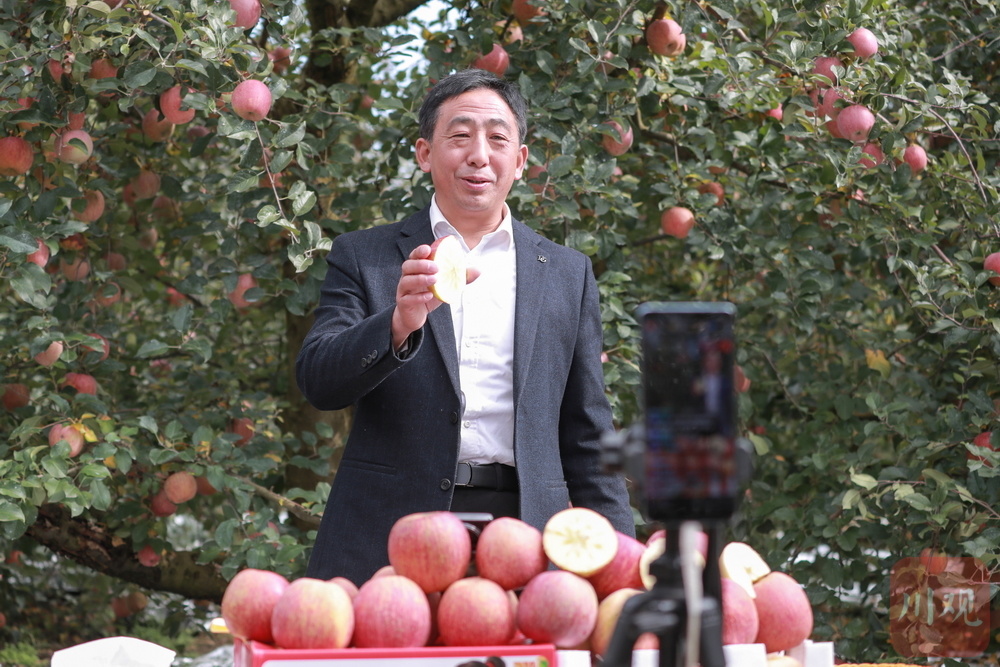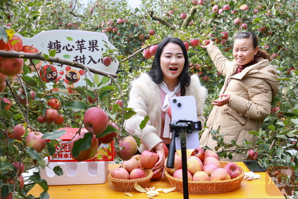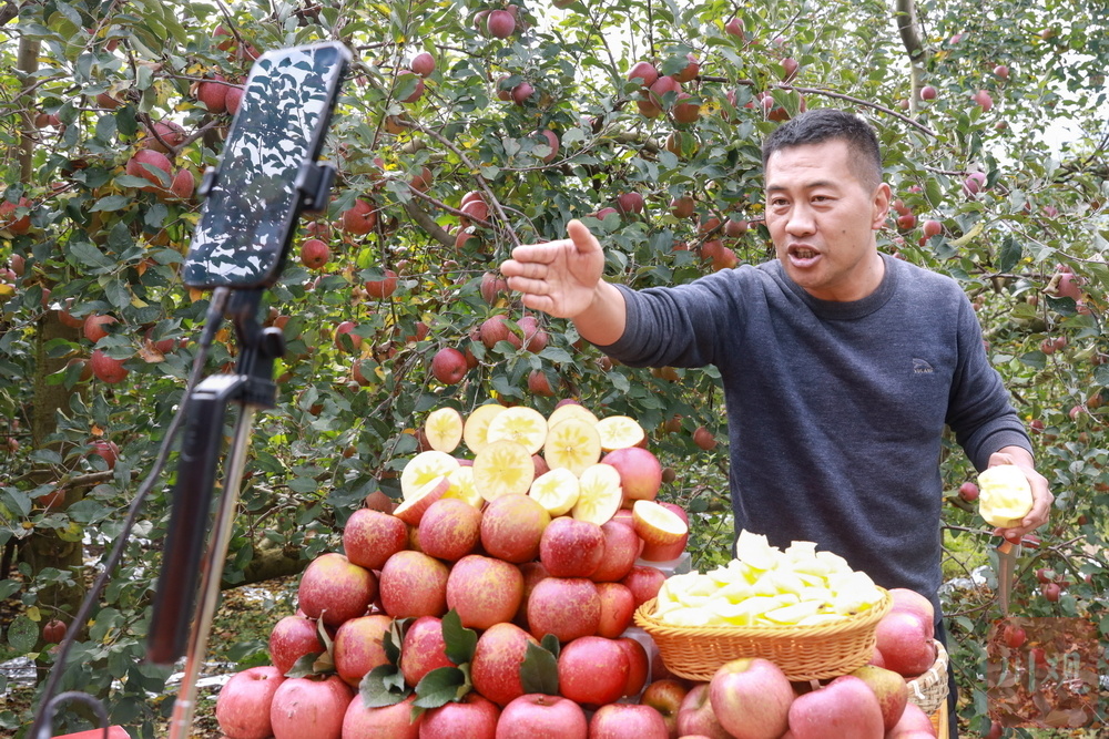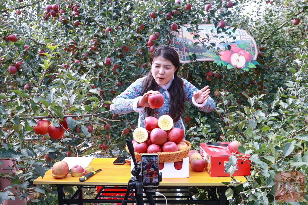 穿棉袄的大婶、回乡创业的姐妹、着西装的村干部、夫妻搭档的果农……11月20日,雅安市汉源县富林镇太平村的苹果林下,汉源糖心苹果上市新闻发布会正热闹举行;一旁的果园内,风格各异的主播们,也正热情洋溢地推介着糖心苹果。