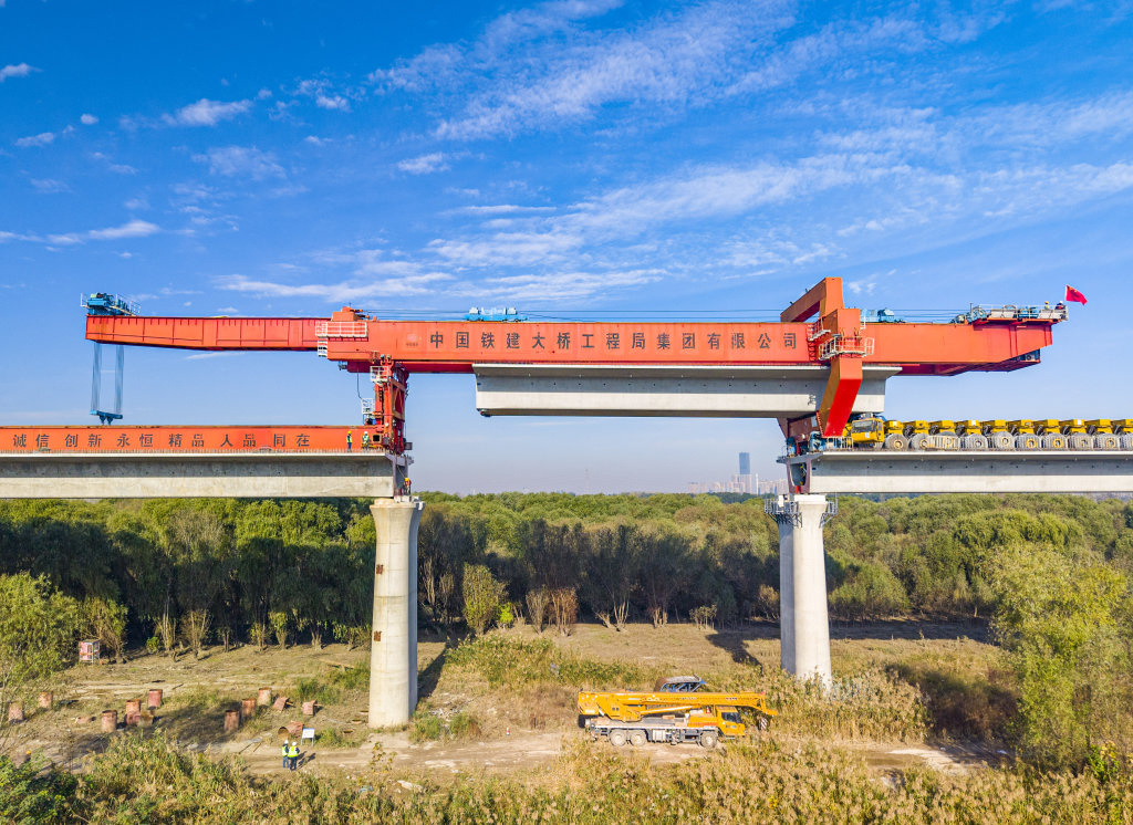 11月20日,中铁建大桥局施工机械在沪渝蓉高铁江都段最后一榀箱梁架设现场作业(无人机照片)。