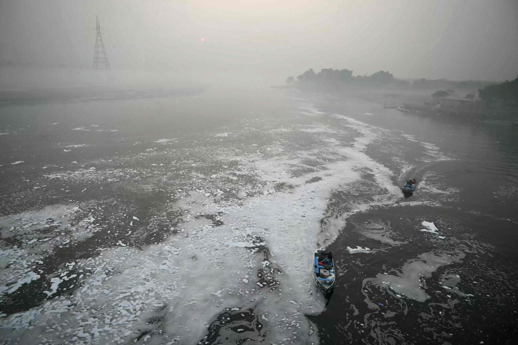 11月20日清晨,在印度新德里,人们在亚穆纳河中行船。
