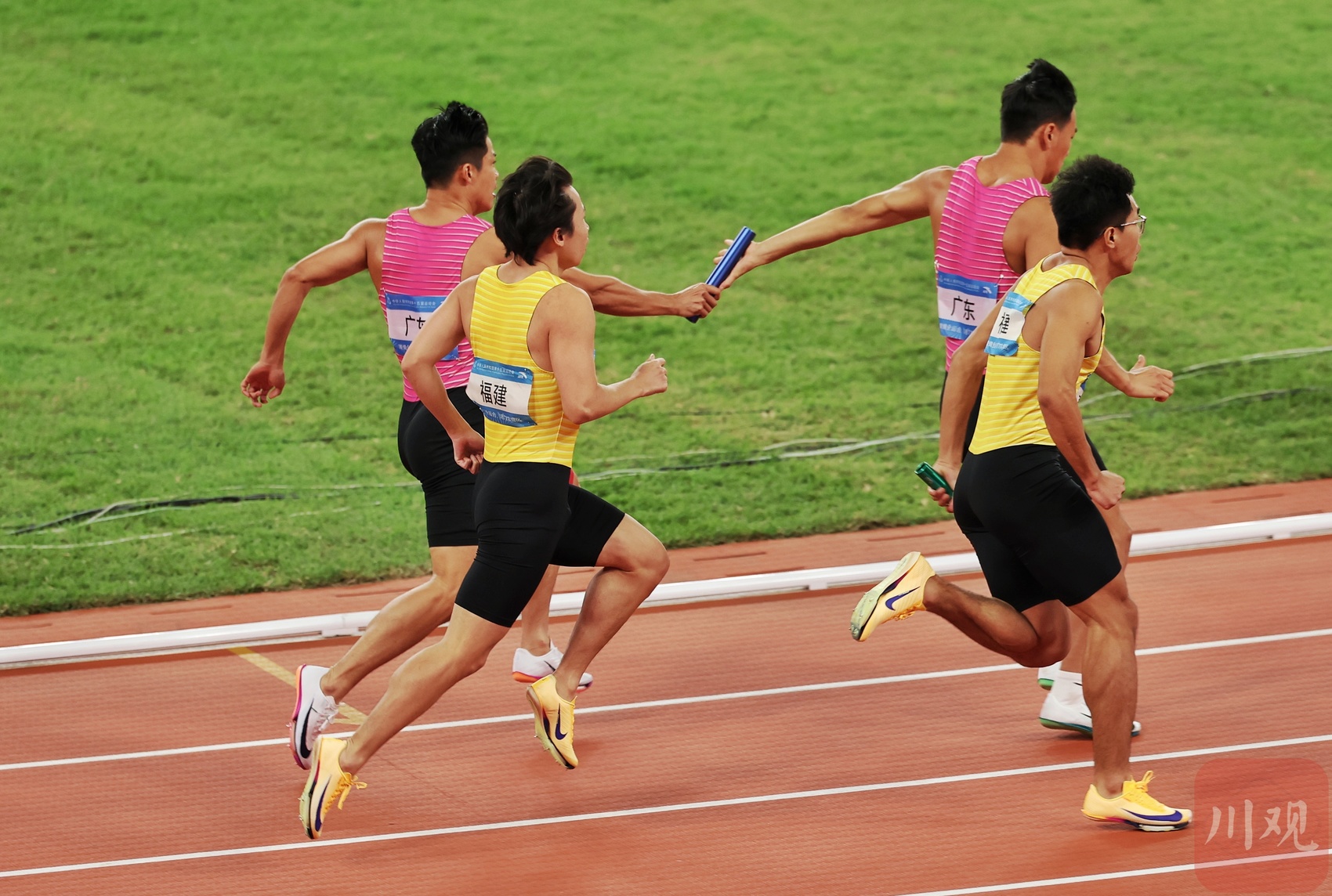 “亚洲飞人”苏炳添在4x100米完成交接棒。
