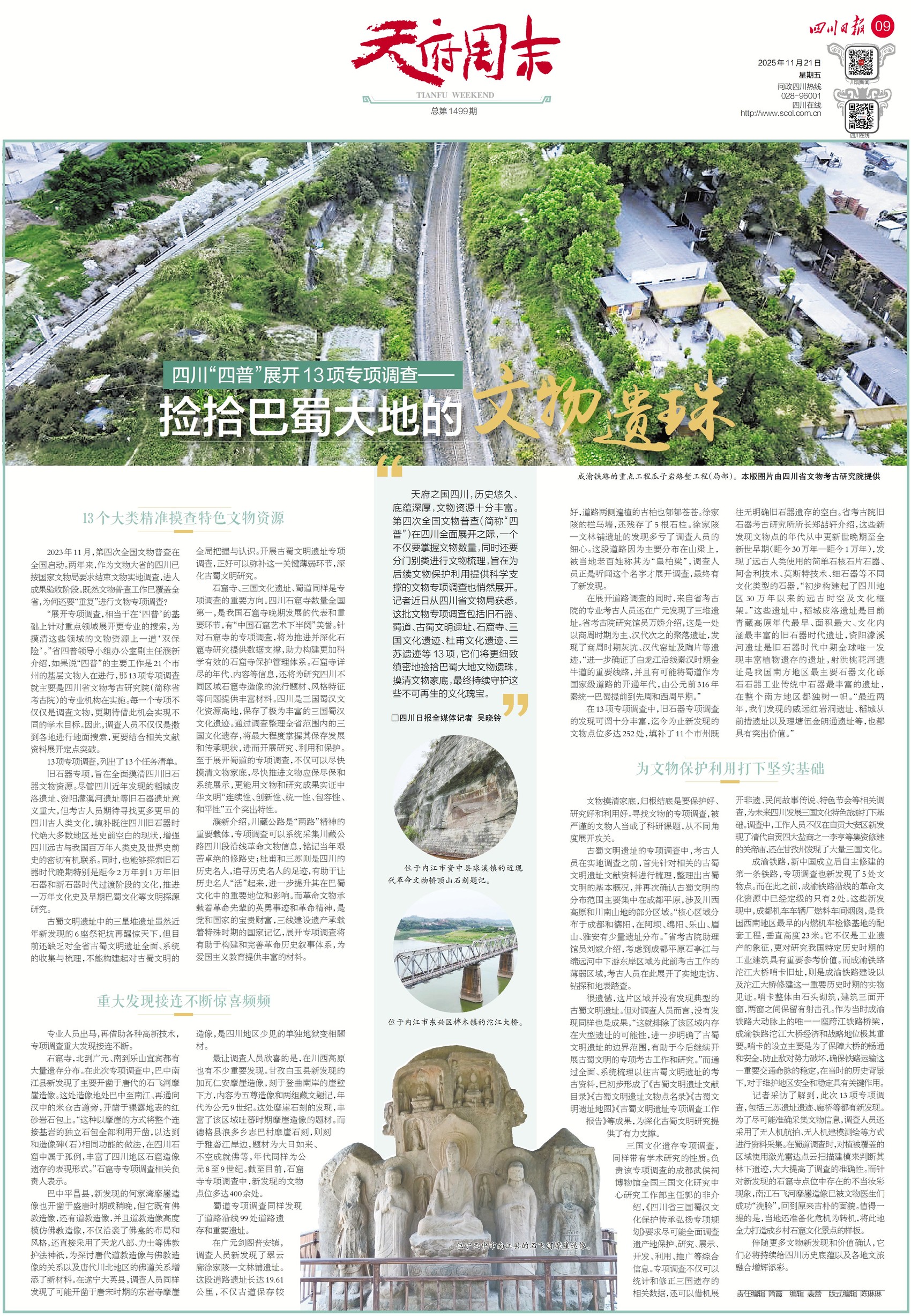 大家都知道四川的文物资源多,这些年是重大发现接连不断惊喜频频,比如三星堆再醒惊天下、资阳濛溪河遗址群入选2024年度全国十大考古新发现。如今,第四次全国文物普查在四川全面展开,与此同时,一个针对旧石器、蜀道、古蜀文明遗址、三苏遗迹等的13项文物专项调查也在悄然进行。既然都有“四普”了,为何还要“重复”进行文物专项调查?专项调查查出啥了?今天九版用整版讲个清楚。