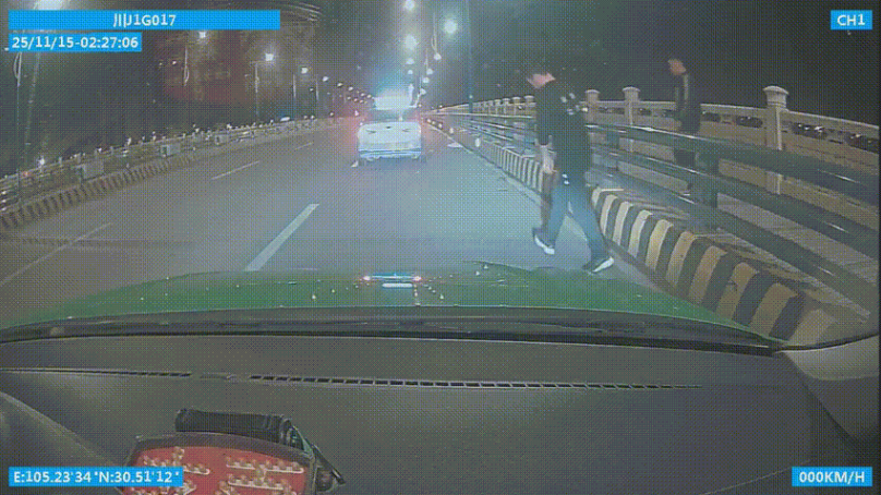 ▲路过涪江三桥时,司机刘涛和乘客跨栏上前帮助司机黄金。