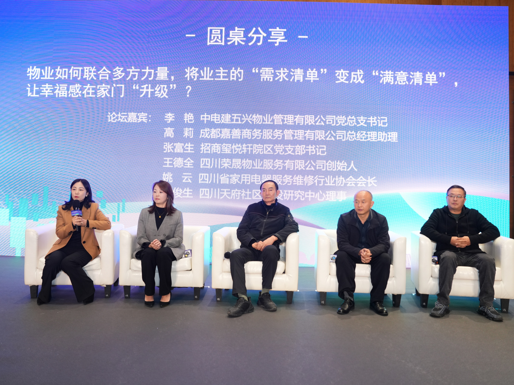 圆桌分享环节以“物业如何联合多方力量,将业主的‘需求清单’变成‘满意清单’,让幸福感在家门口升级”为主题,将大会讨论推向高潮。中电建五兴物业管理有限公司党总支书记李艳、成都嘉善商务服务管理有限公司总经理助理高莉、招商玺悦轩院区党支部书记张富生、四川荣晟物业服务有限公司创始人王德全、四川省家电维修协会会长姚云、四川天府社区建设研究中心理事王俊生等嘉宾,结合各自领域的实践经验,围绕资源整合、服务精准化、技术创新、跨界合作等议题展开了热烈讨论。嘉宾们认为,物业企业需主动转型,搭建多元共治平台,精准对接人民日益增长的美好生活需要,方能将一项项具体需求转化为实实在在的满意成果。