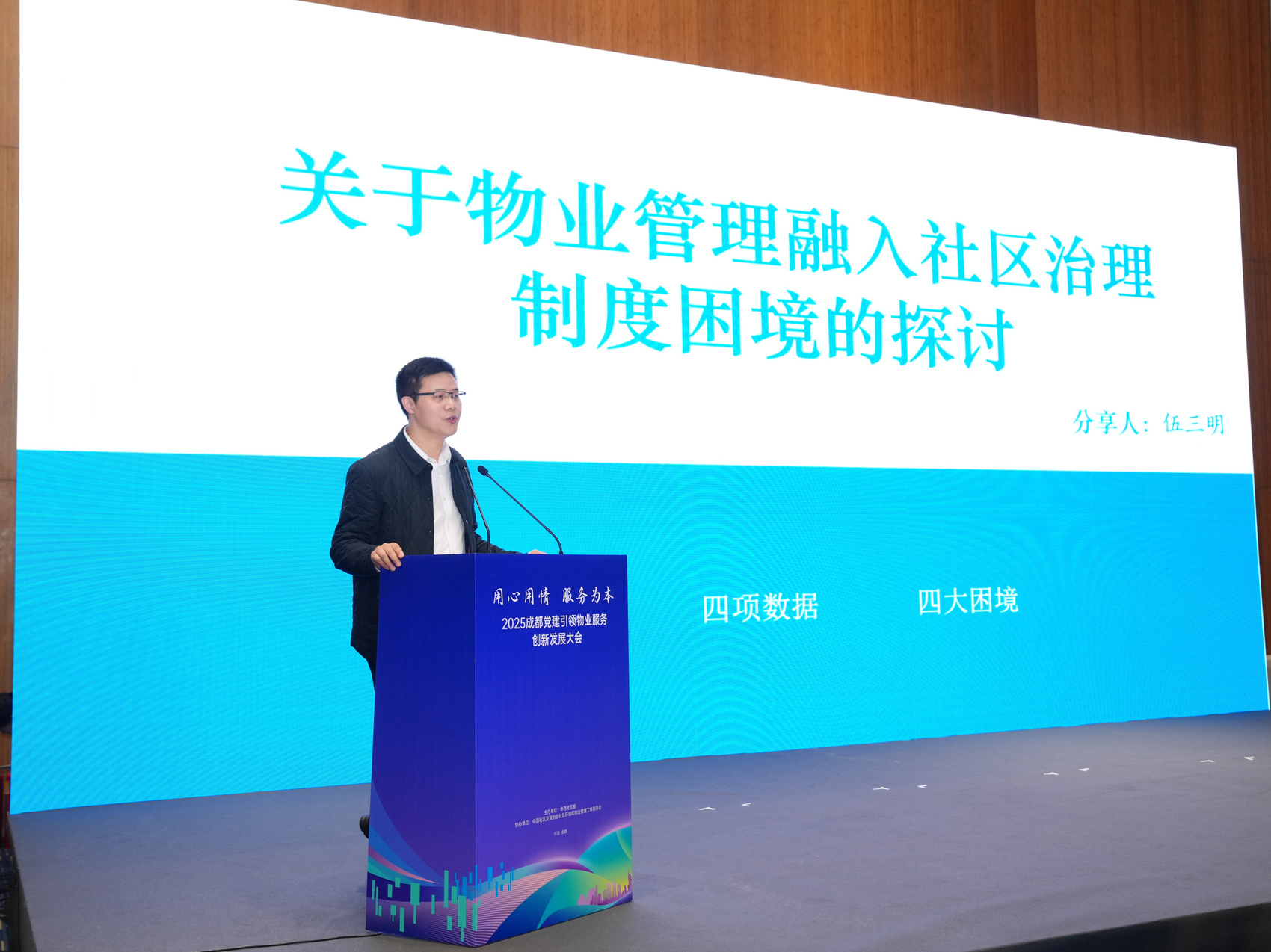 在主题演讲环节,四川天府社区建设研究中心主任、住房和城乡建设厅物业专家伍三明带来了题为《关于物业管理融入社区治理制度困境的探讨》的深度分享。他系统剖析了当前物管融入社区治理面临的现实挑战与制度壁垒,并提出了富有建设性的破解思路与发展路径,为行业创新提供了理论支撑和实践指引。