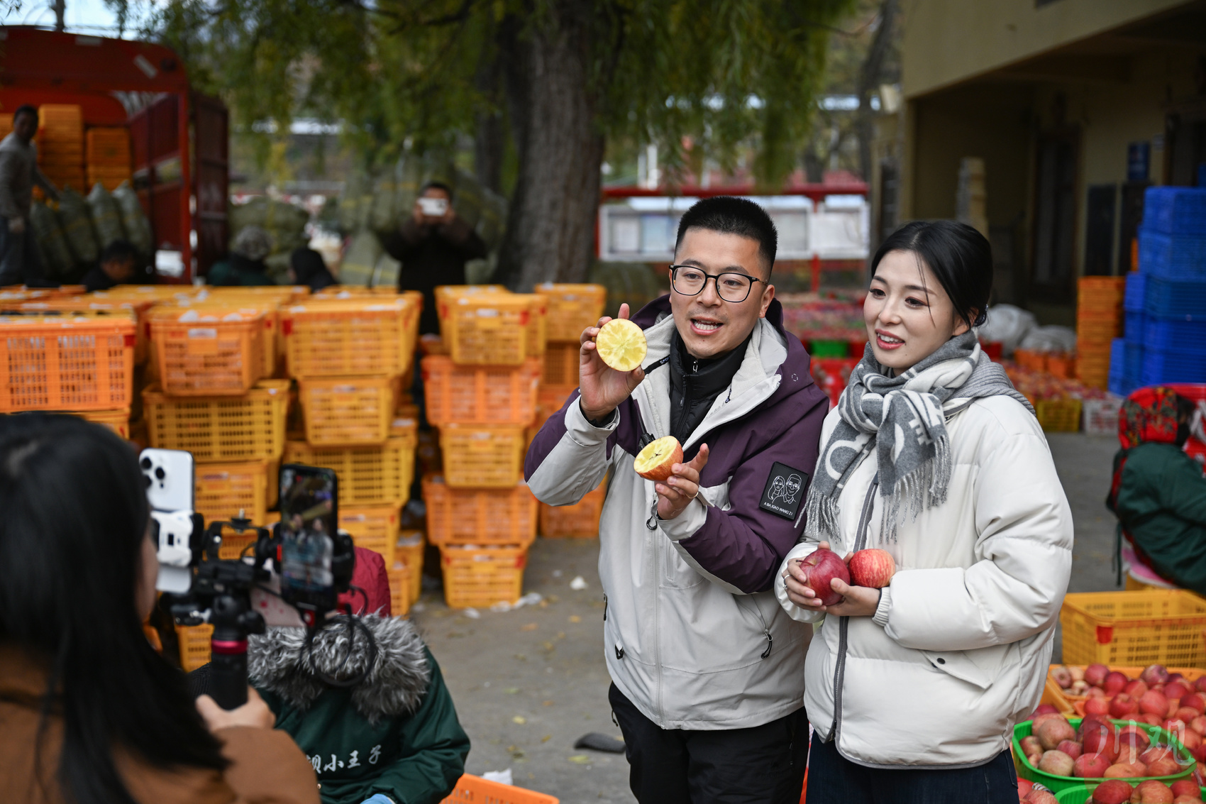 距离果园三公里外的村庄里,电商达人王光强和妻子黄月正对着手机屏幕热情推介:“朋友们,来开个‘盲盒’,看看您收到的苹果有没有糖心!”他们身后,数百筐新鲜采摘的苹果铺满场地,工作人员正有条不紊地包装、整理,为发货做足准备。