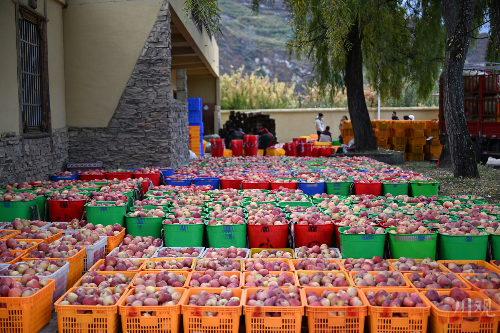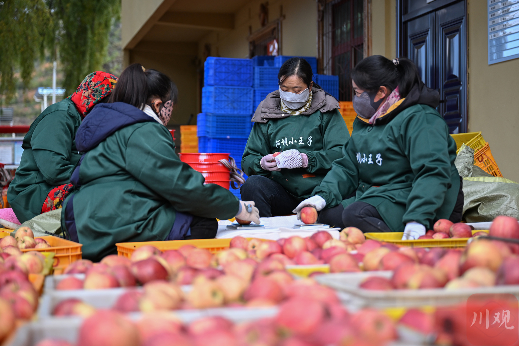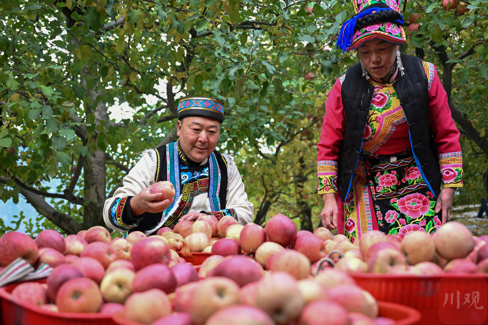 茂县南新镇安乡村苹果园内,果农对新鲜采摘的苹果进行分拣。