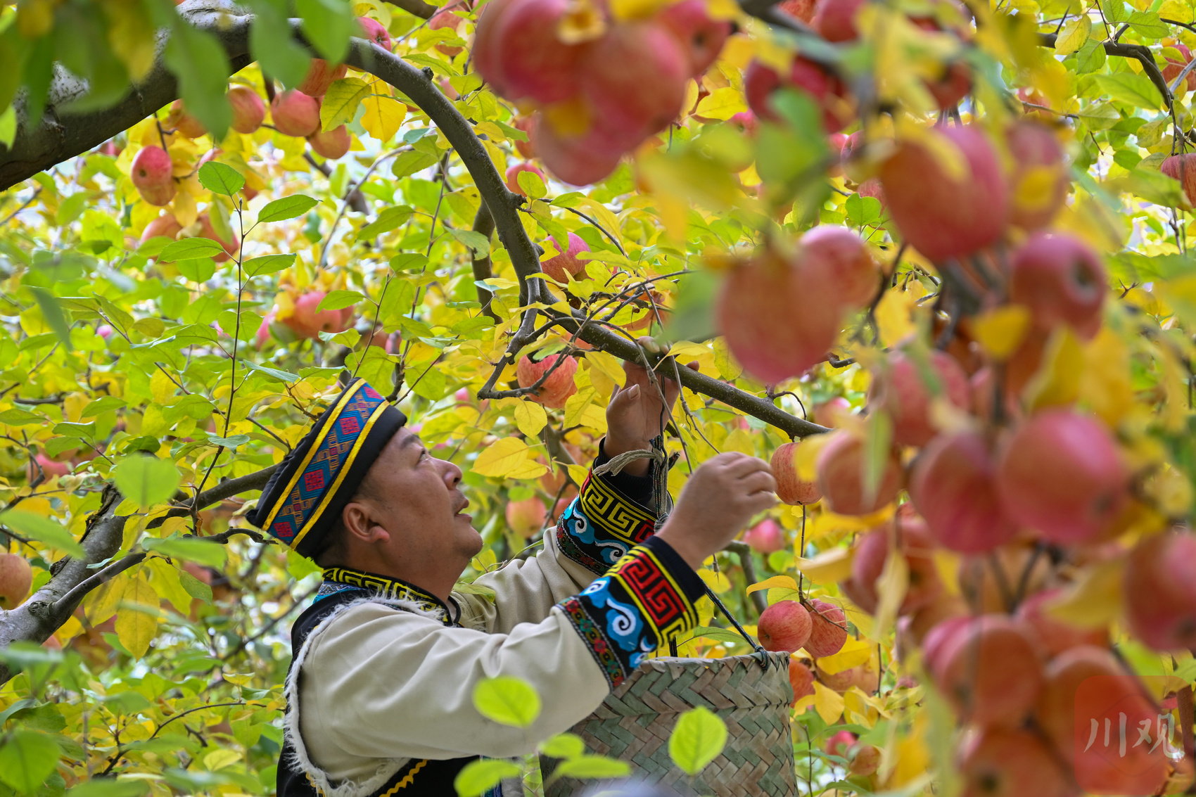 茂县南新镇安乡村苹果园内,果农正在采摘苹果。