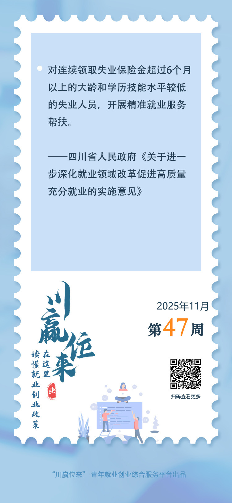 近日,四川省人民政府印发《关于进一步深化就业领域改革促进高质量充分就业的实施意见》,明确提出对连续领取失业保险金超过6个月以上的大龄和学历技能水平较低的失业人员,开展精准就业服务帮扶。