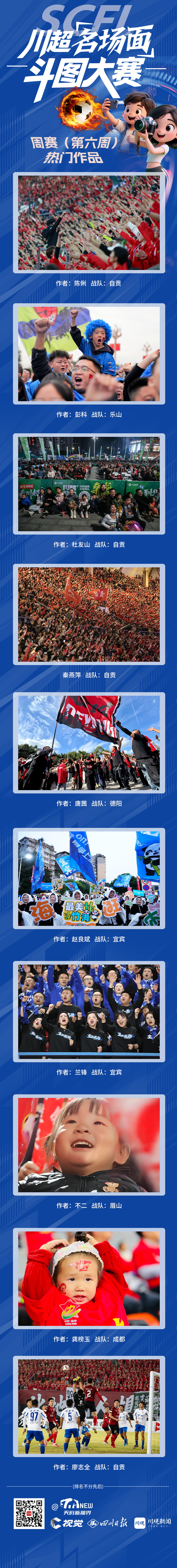 截至11月22日零点,周赛(第六周)点赞环节告一段落,在近百件参赛作品中,经过全川球迷的热情投票以及专业人士评分,第六周十佳作品脱颖而出: